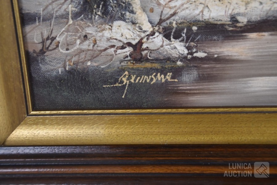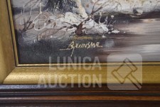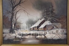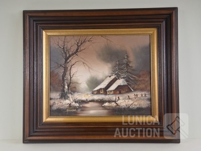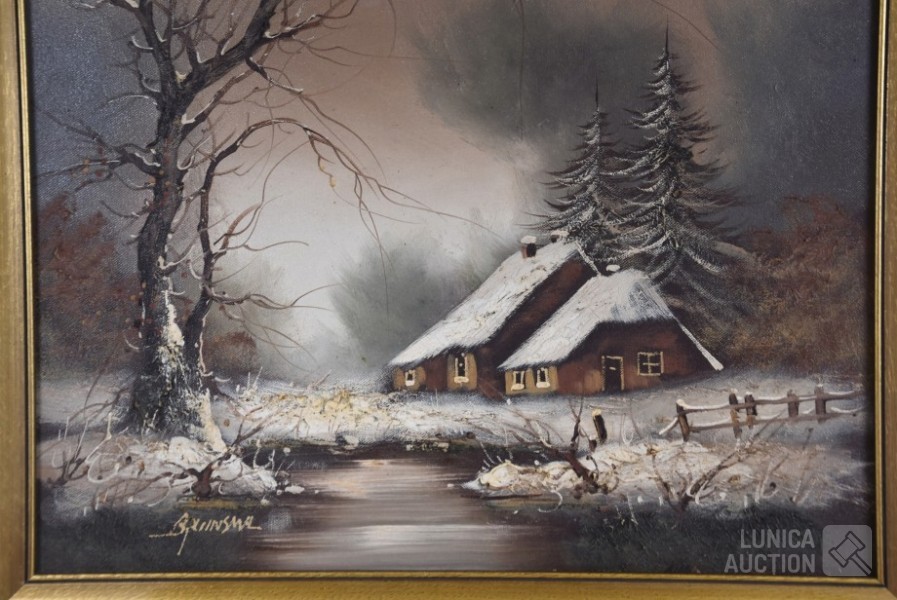 Olieverf op doek, "huis in sneeuwlandschap"