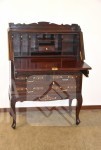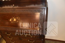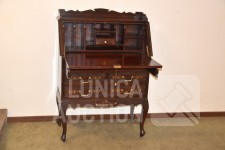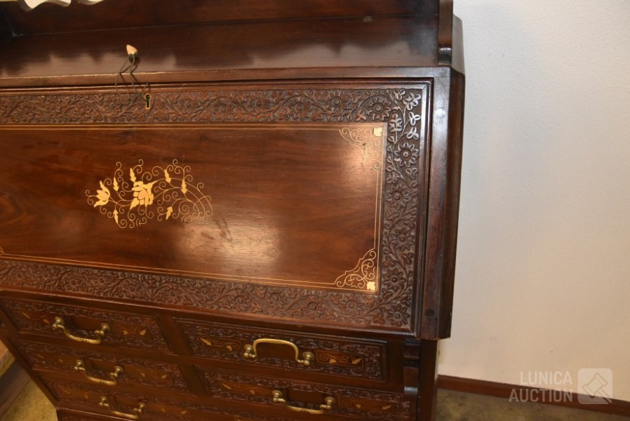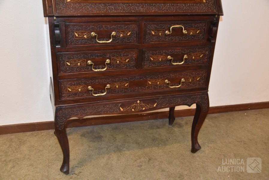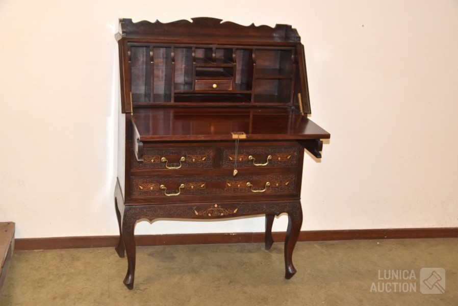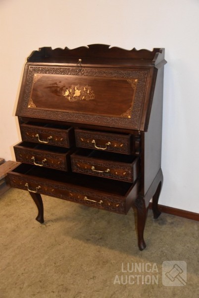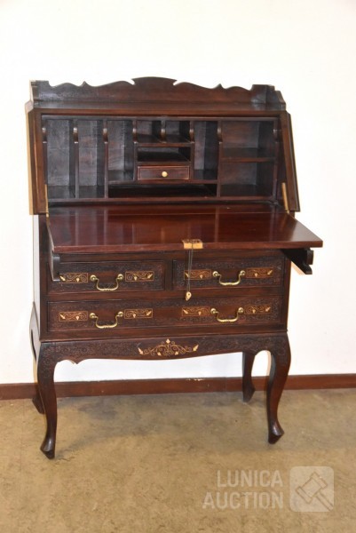 hardhout met houtsnijwerk. Afmeting (bxdxh) 80x38x112 cm. Sleutel schrijfgedeelte ontbreekt. Secretaire is 2-delig: ladeblok staat op onderstel