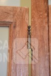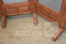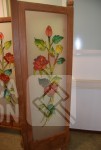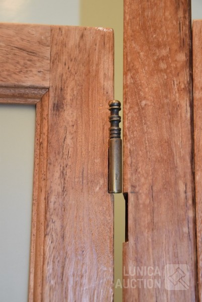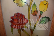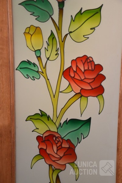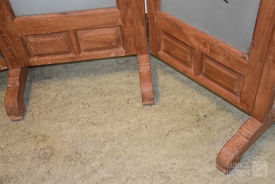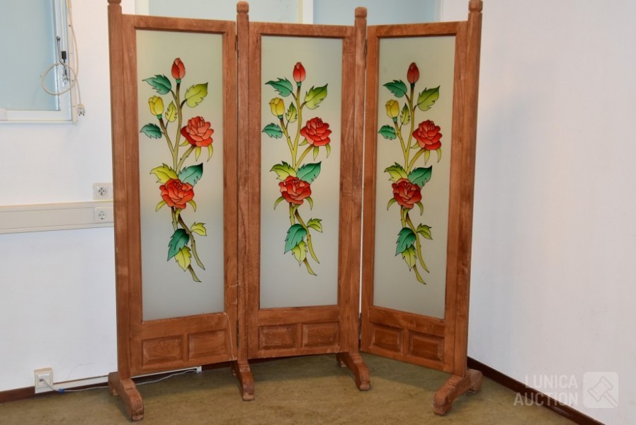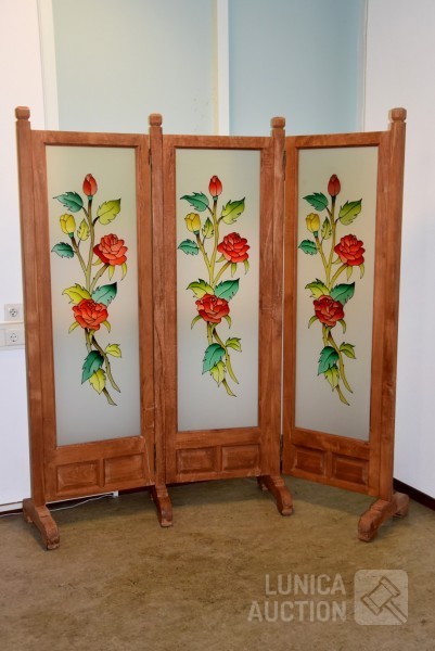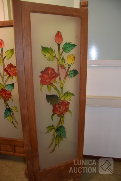 Handbeschilderd glas met "loodrand" langs beschildering, hierdoor aan één zijde glas-in-lood effect. Afmeting per deel 60x190 cm. Totaal ca. 190x190 cm. Teakhout. Één scharnier op één kamerscherm ontbreekt.