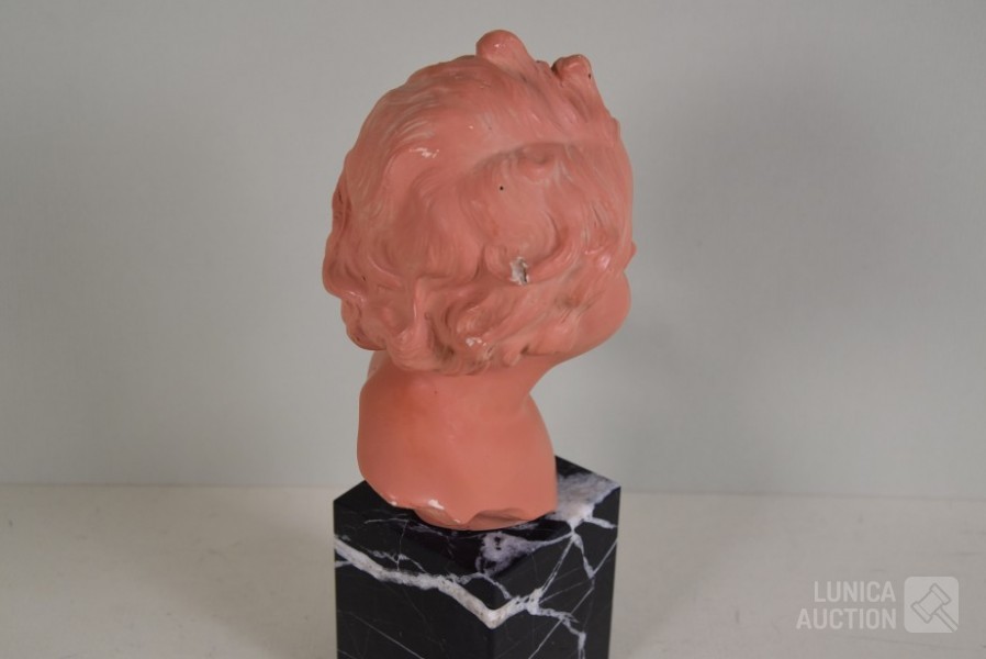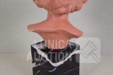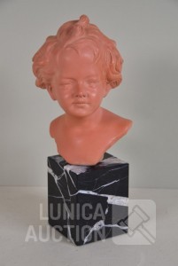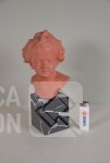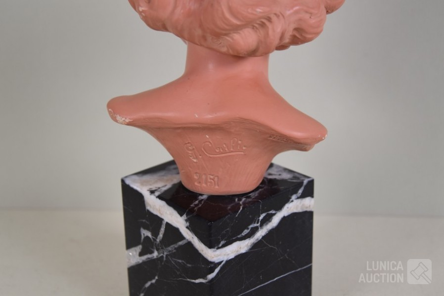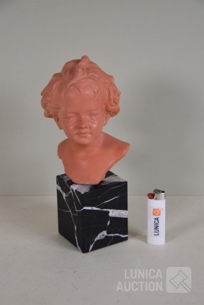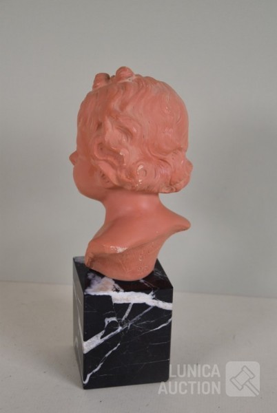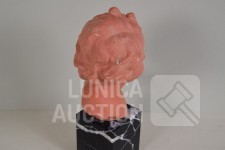 Beeldnummer 2151, onbekend materiaal in terracottakleur op natuurstenen sokkel. Hoogte 27 cm. Enkele kleine beschadigingen aan beeld.