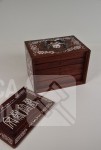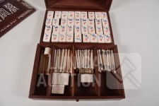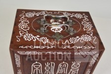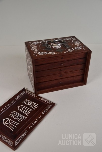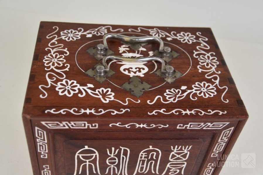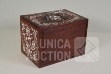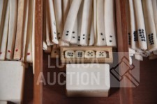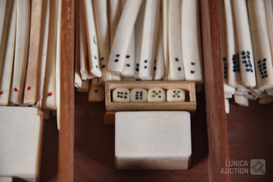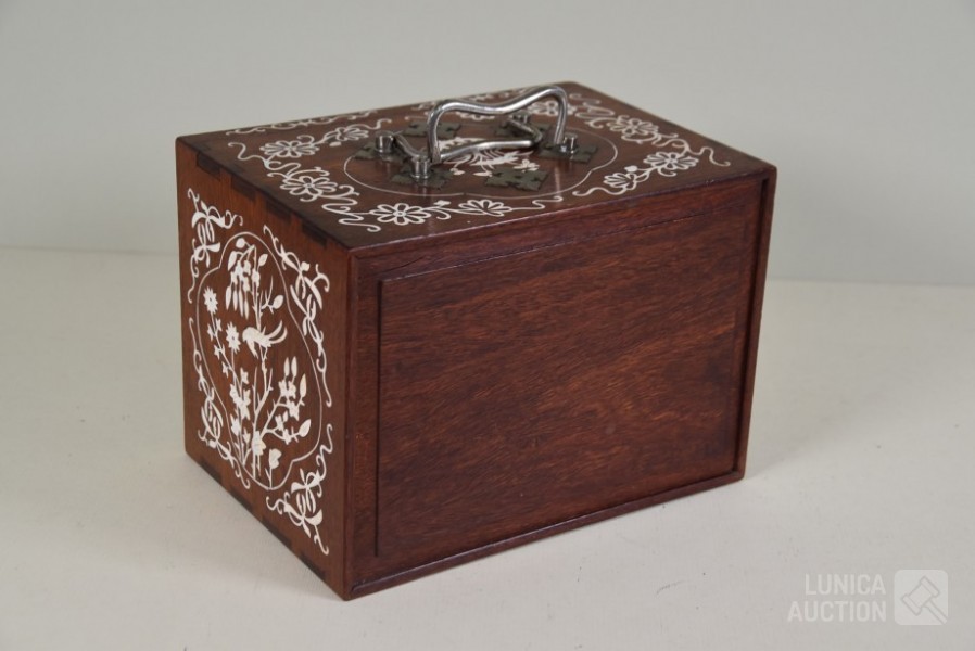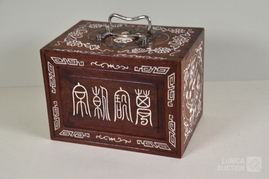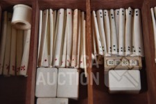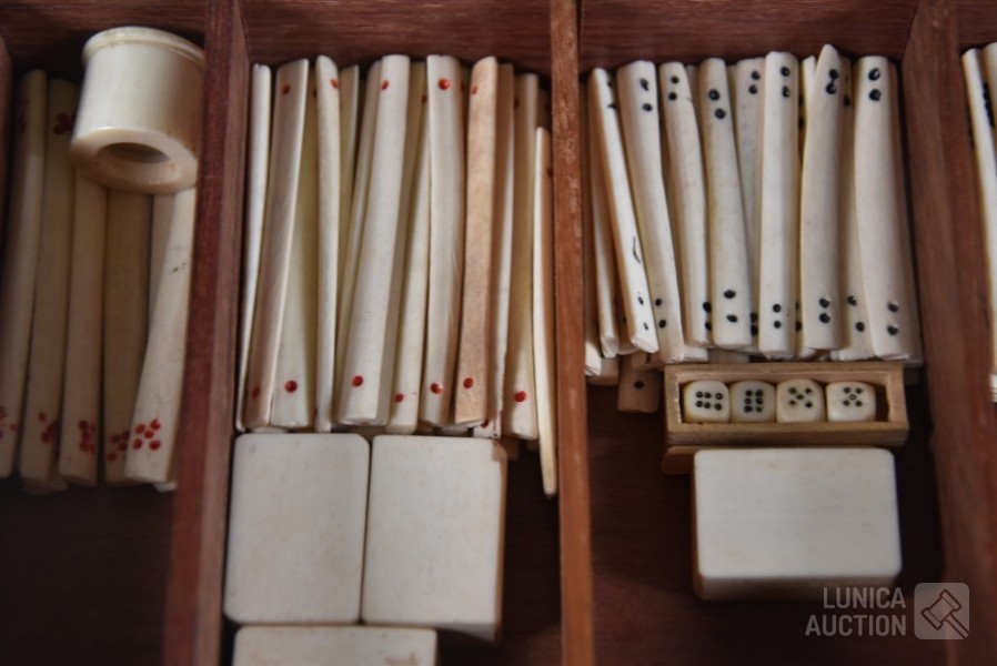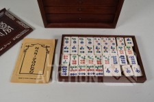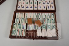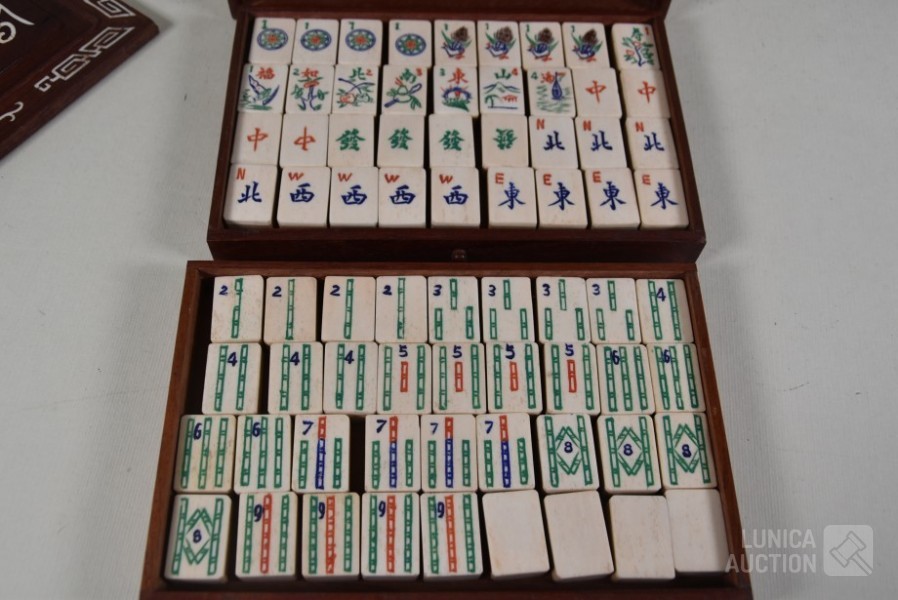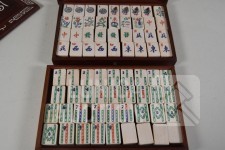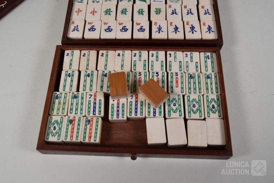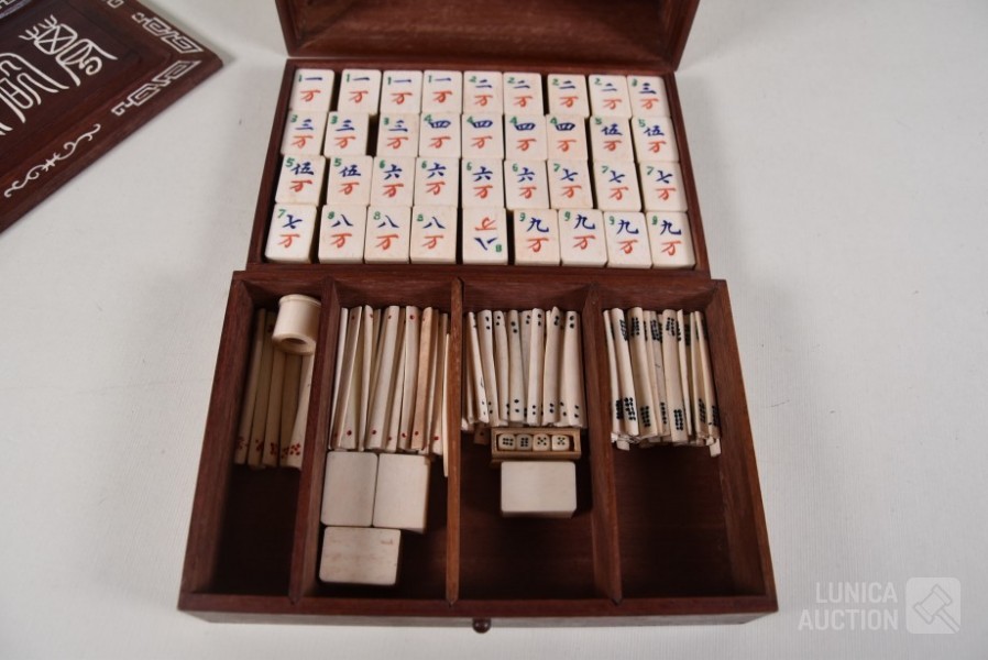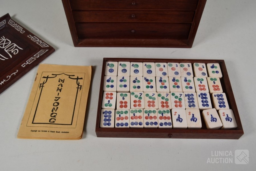 Met 144 stenen en toebehoren, inclusief Nederlandse gebruiksaanwijzing met op de achterzijde de tekst "Mah-jongg spelen geleverd door WJ Hessels Hang 94 Rotterdam , telefoonnummer 1956" ( uit de jaren'50) Stenen zijn gemaakt van been en bamboe. Kist is ingelegd met been en rijkelijk versierd. Afmeting 23x16x17 cm. Mooie set!