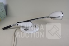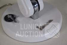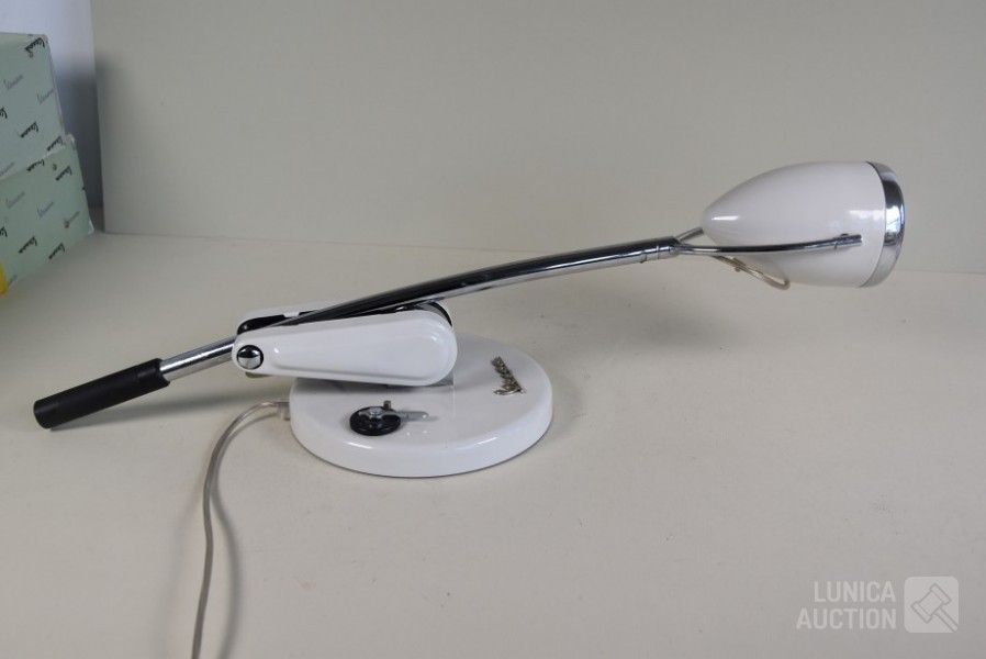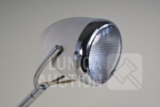Nummer 808; Lamp Par30 75 watt. Kleur ivoor wit/chroom. In originele verpakking. Vespa adviesprijs € 369, -- Afmeting (bxh) ca. 23x60 cm. Hoogte is verstelbaar, "koplamp" is draaibaar. Vintage uitstraling.