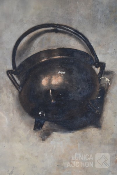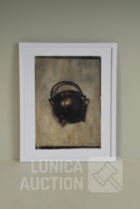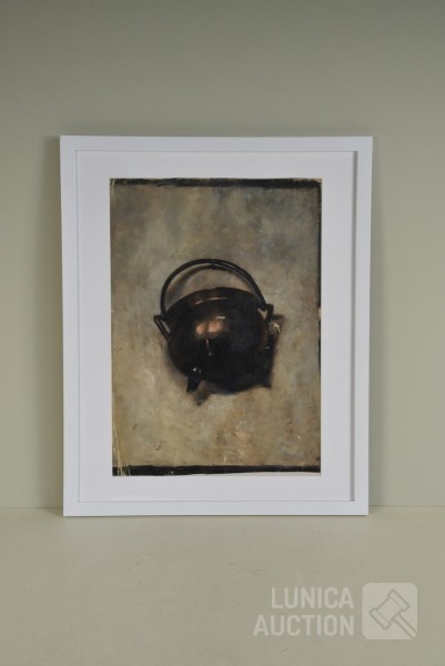 Het betreft schildersdoek, ingelijst, achter plexiglas. Afmeting 44x53 cm.
