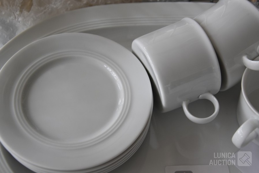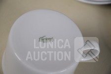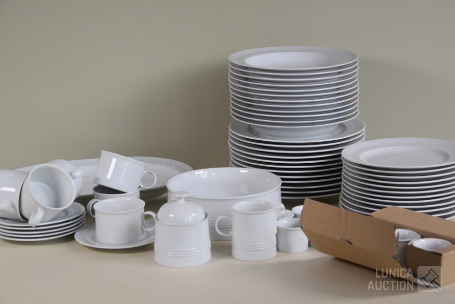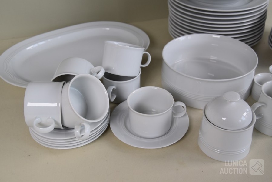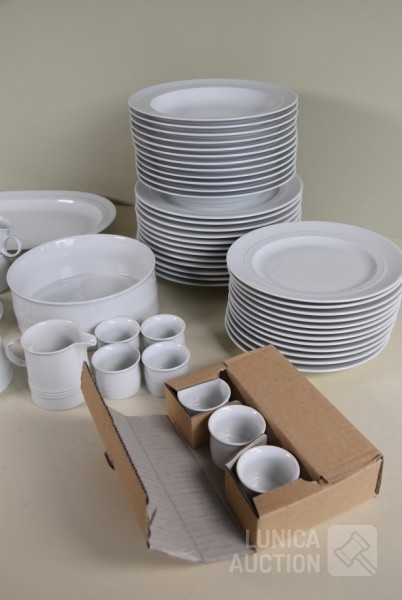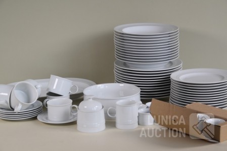 Ca. 62 stuks; o.a. 6x kop en schotels, 12x grote borden, doorsnede 25 cm; 12x kleine borden, doorsnede 20 cm; 12x diepe borden, doorsnede 22 cm; 10x eierdop; Melkkan, suikerpot enz.
