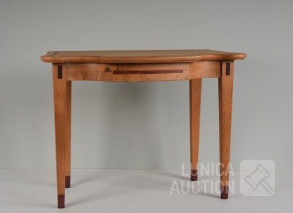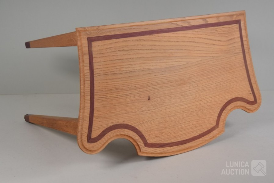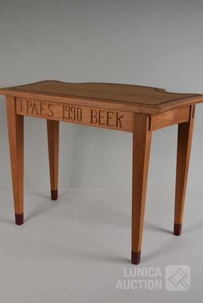 Gebruikte materialen: eikenhout met inleg van palissander hout. Afmeting (bxdxh) 56x27x42 cm. Johan Paes, Beek (1938-2022). Een kunstzinnige timmerman. Beekenaar Johan Paes, timmerman van beroep, had als “hobby” het ververvaardigen van meubelen en heel bijzondere klokken. Zijn superieure vakmanschap is terug te zien in het aanbod van de kunstige en minutieus gemaakte voorwerpen in hout. Zijn inspiratie haalde hij uit de Art Deco stijl en in zijn klokken herken je de architectuur van de beroemde hoge gebouwen in New York.