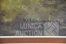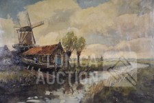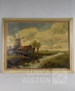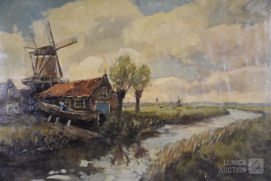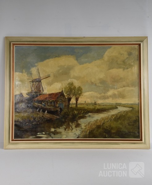 "landschap met molen", olieverf op doek, ingelijst. Afmeting 91x71cm. Gesigneerd R.O. Op de lijst aan de achterzijde staat stempel van Kunsthandel Meerman Haarlem. Doek is vergeeld, kan worden schoongemaakt.
