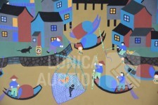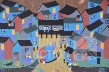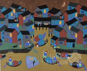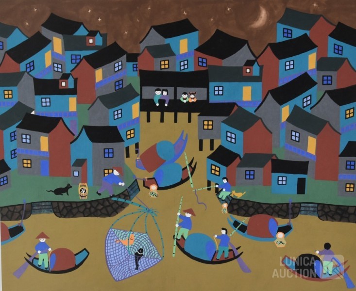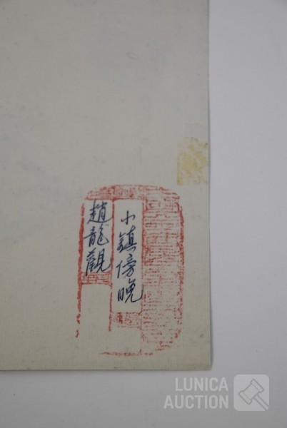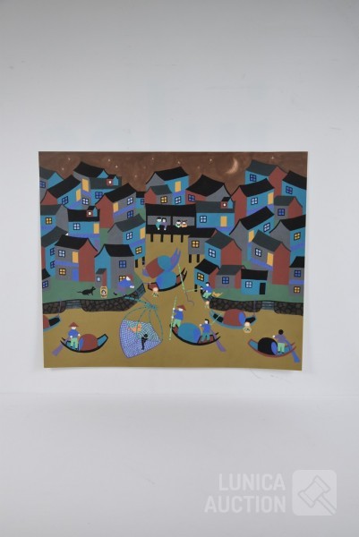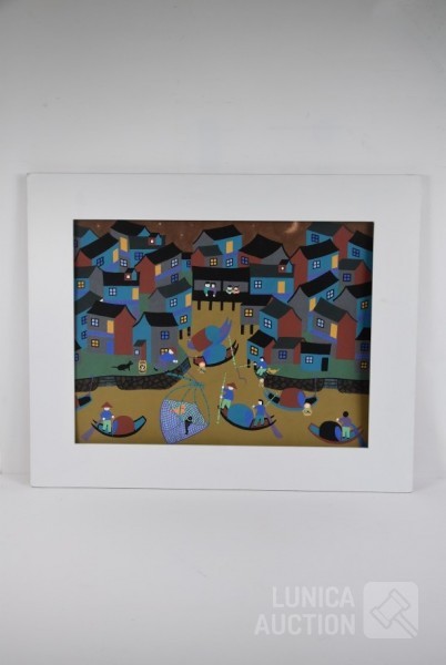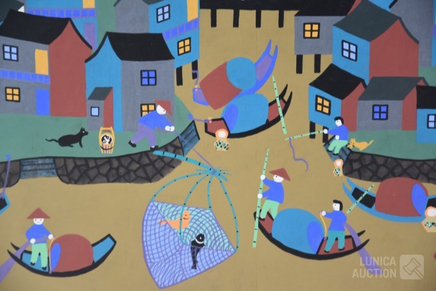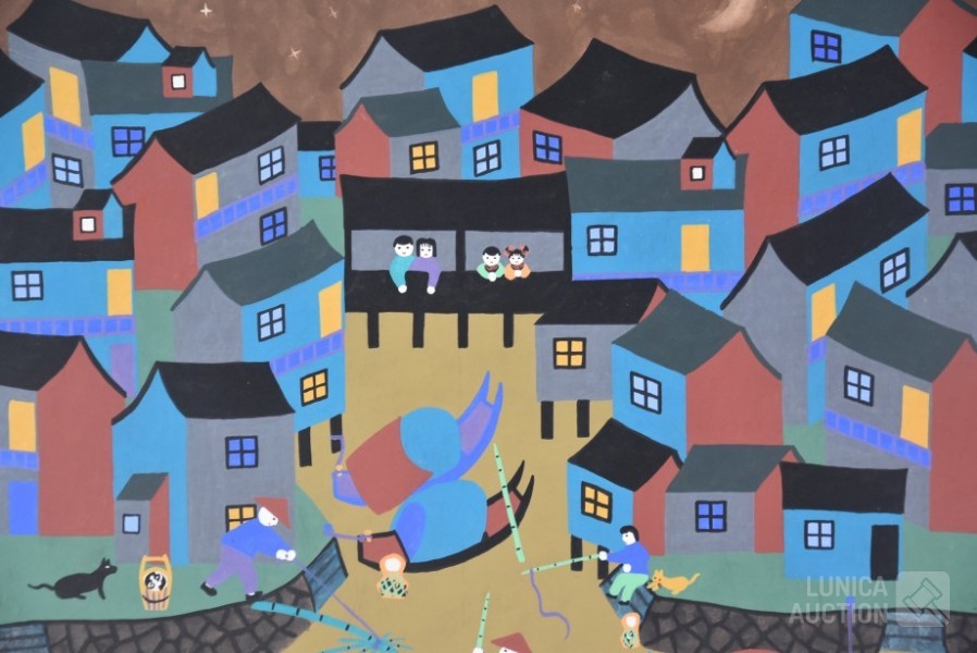 "Jinshan boerenschilderkunst", acrylverf op papier, niet ingelijst, gesigneerd op achterzijde, afmeting 64x52 cm. Lijst niet inbegrepen.