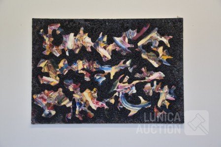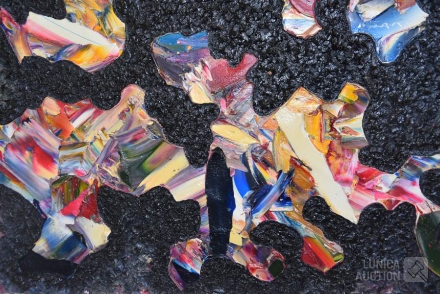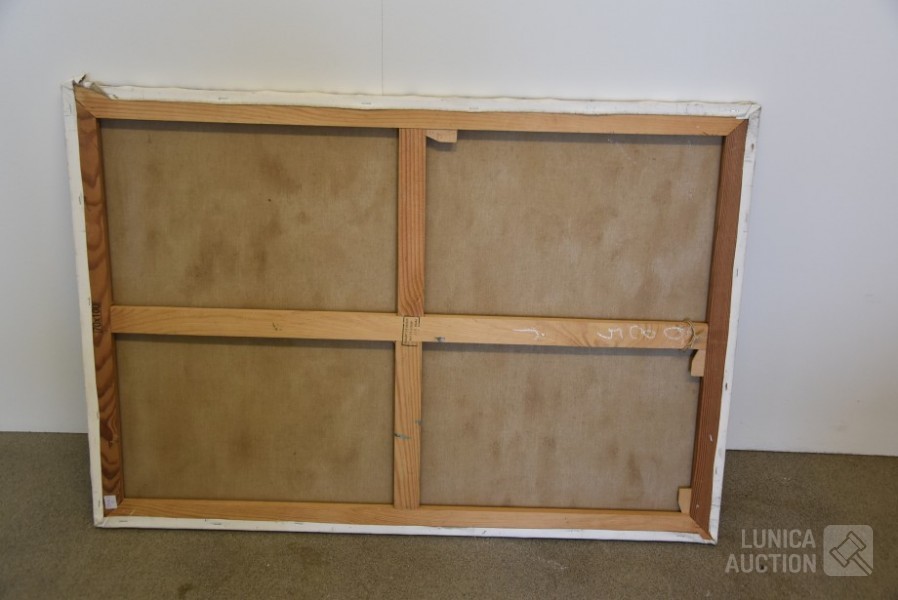 dikke laag acrylverf op doek, niet ingelijst, afmeting 70x100 cm. Op achterzijde voorzien van stempel atelier Waterschoot. Waterschoot uit Gent is fotograaf-schilder.