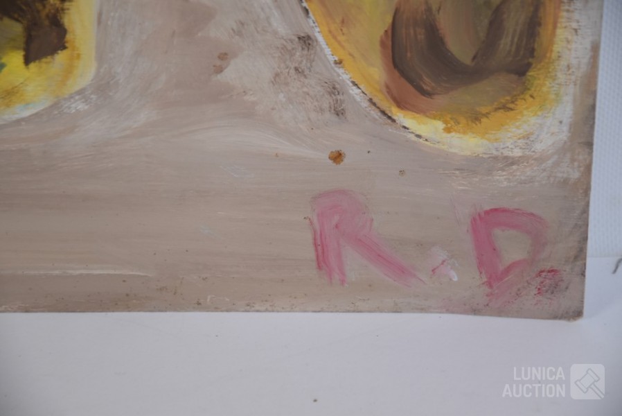 olieverf op schilderskarton, gesigneerd met monogram RD, afmeting 60x80 cm. De getoonde lijst en passe-partout dienen ter illustratie en worden niet meegeleverd.