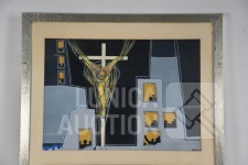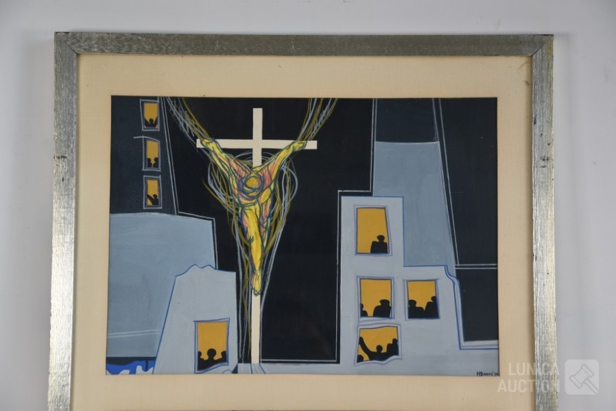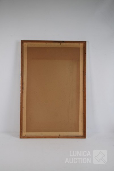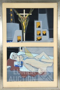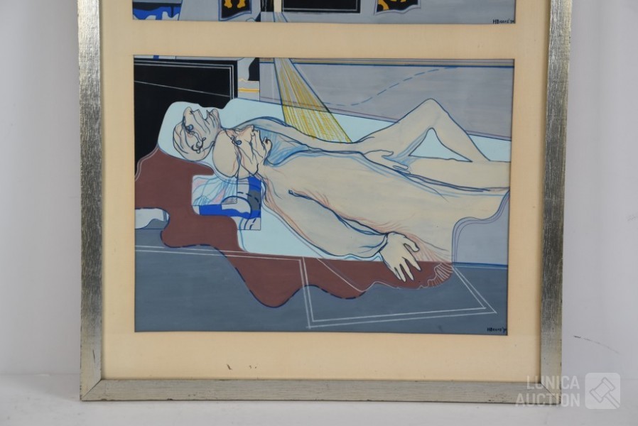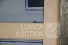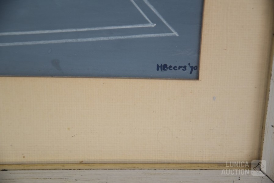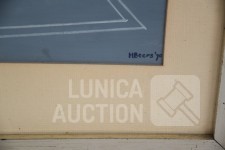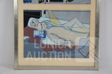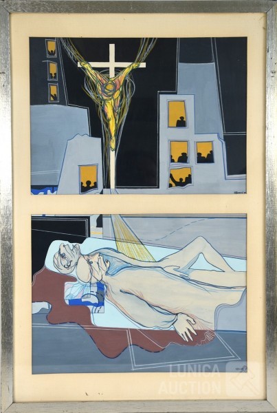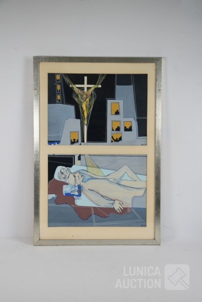 2 werken in acrylverf/pastelkrijt, verwerkt in één passe-partout, ingelijst, achter glas. Afmeting 53z78 cm