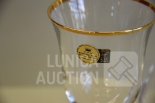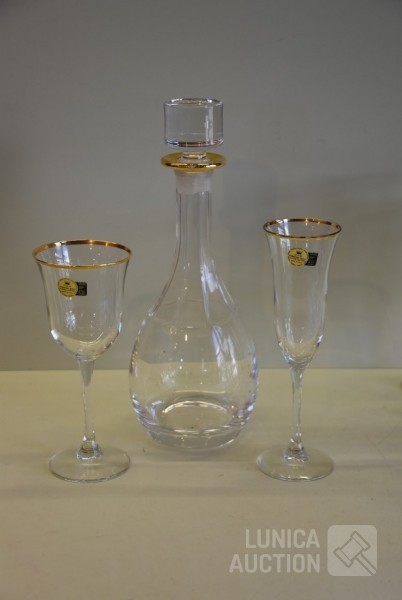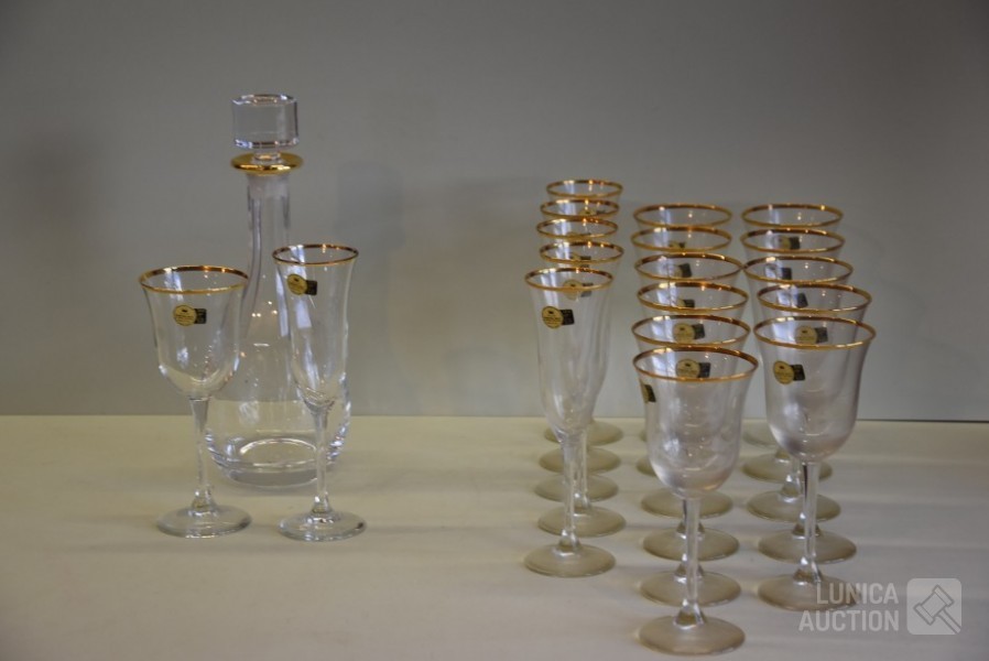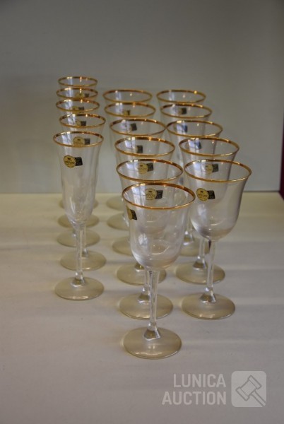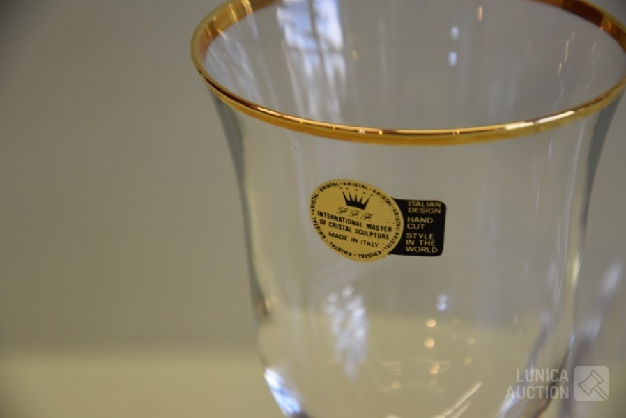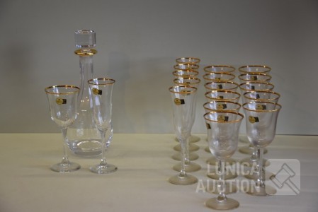 Italiaans kristalglas met goud vergulde rand. 2 modellen glazen, 6x champagne glas hoogte 22 cm; 12x wijn glazen hoogte 19 cm; 1x karaf met stop, hoogte 31 cm.
