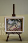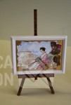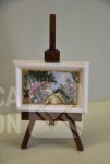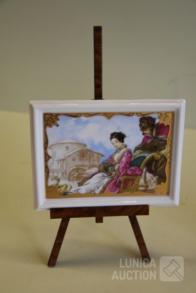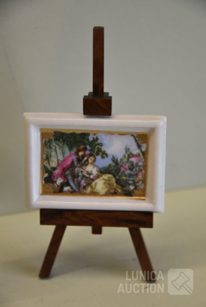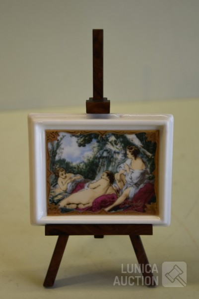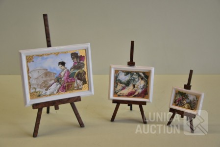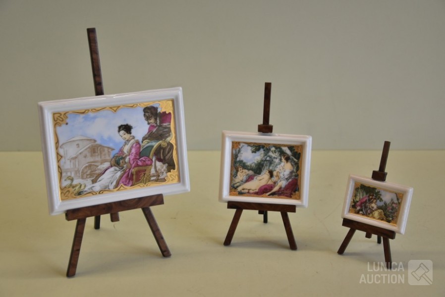 Het betreft 3 kleine porseleinen kunstwerkjes op kleine schildersezels, beschilderd met rand van "24 Kt gold", Afmeting kunstwerkjes 6x4 cm, 9x7 cm en 13x10 cm. In goede staat.