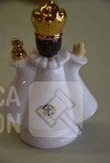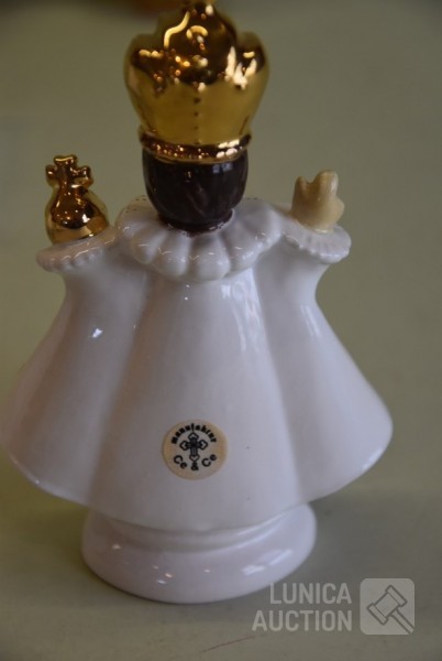 o.a. kleine crucifix hanger, lengte 7 cm; 2x porselein beeld Ce&Ce manufaktur, hoogte 14 cm; crucifix op geslepen glas, hoogte 8 cm; 2x kaars, hoogte 17 cm, "Postel P Marie Vitez, Praag"