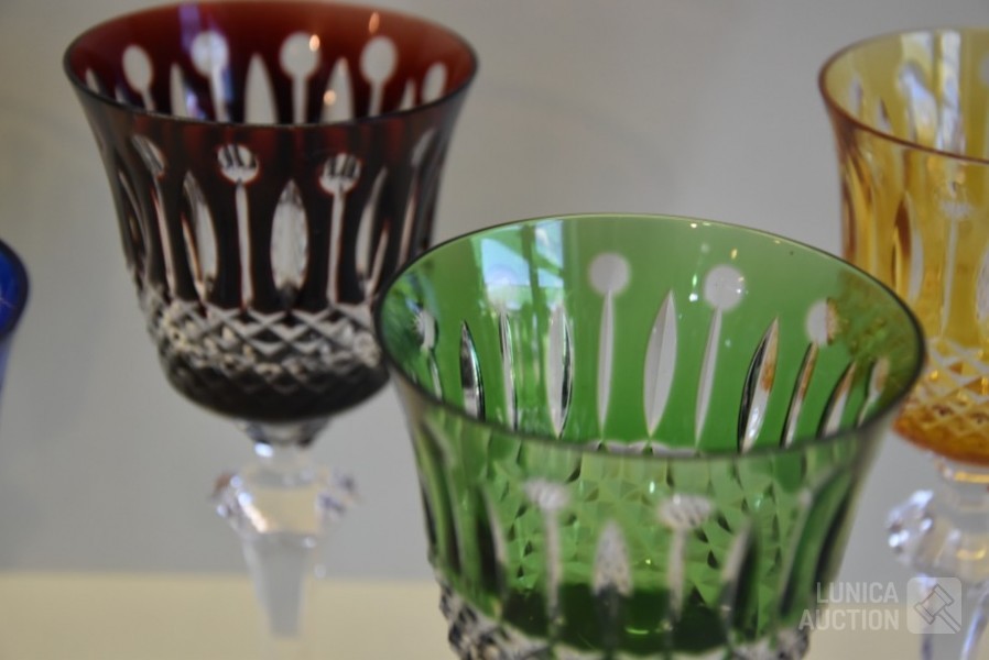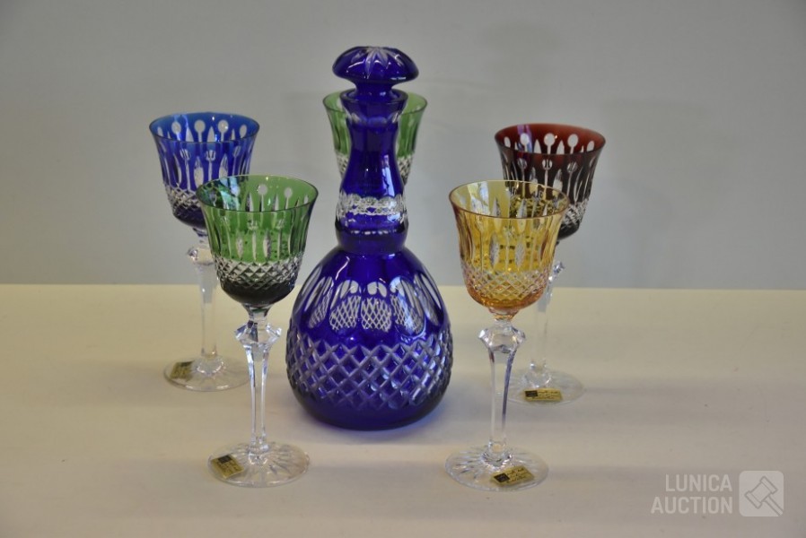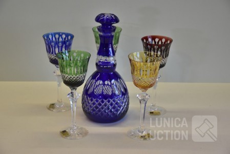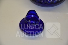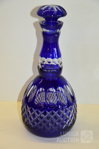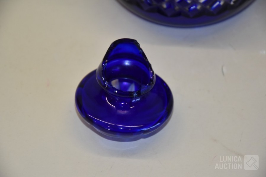 Hoogte 21 cm en 30 cm. Enkele chips op 2 randen glas, stop is stuk aan onderzijde.