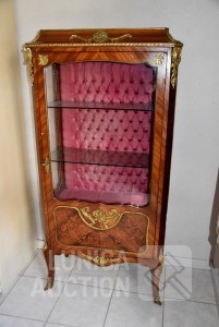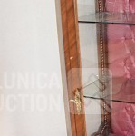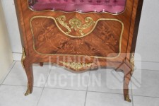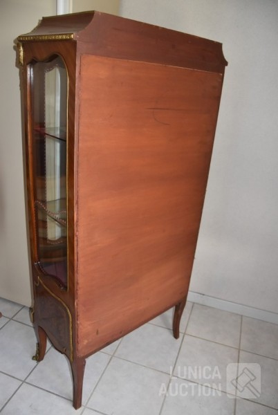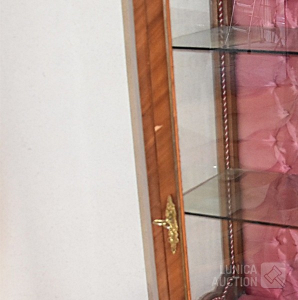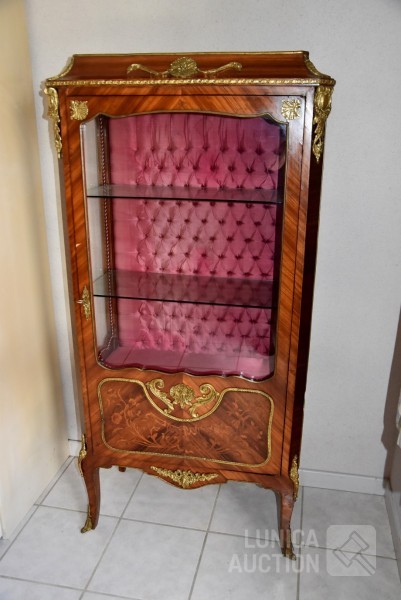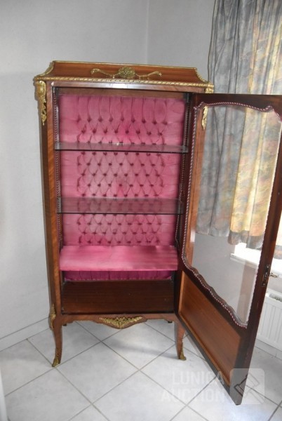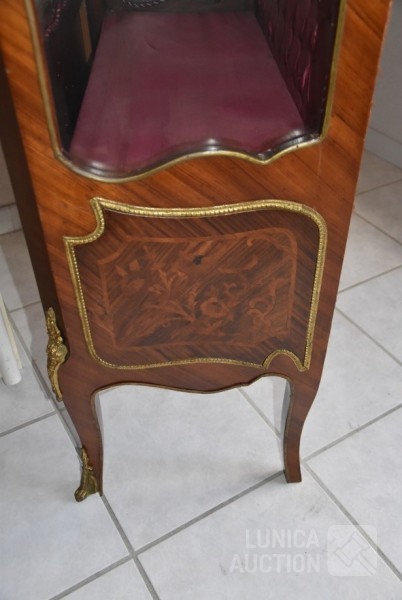 Inlegwerk van rozenhout, 2 legplanken van glas. Gecapitonneerde gestoffeerde achterwand. Kleine beschadiging van fineer voorzijde deur. Afmeting (bxdxh) 82x40x163 cm