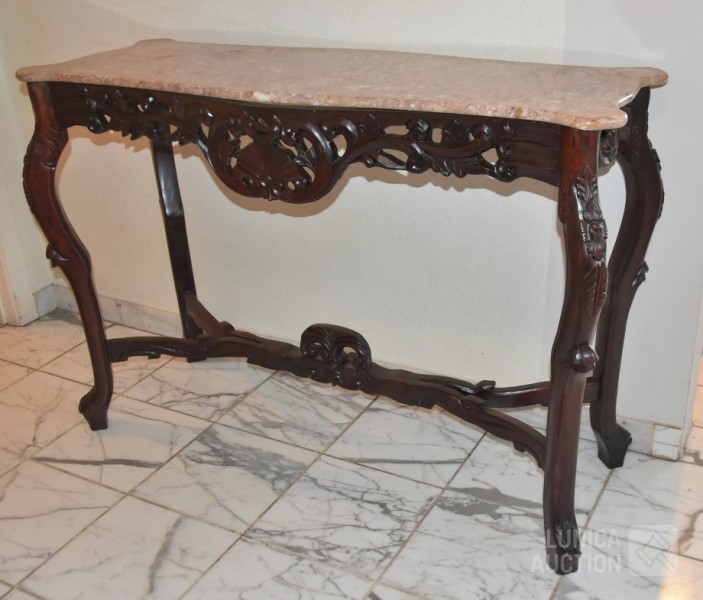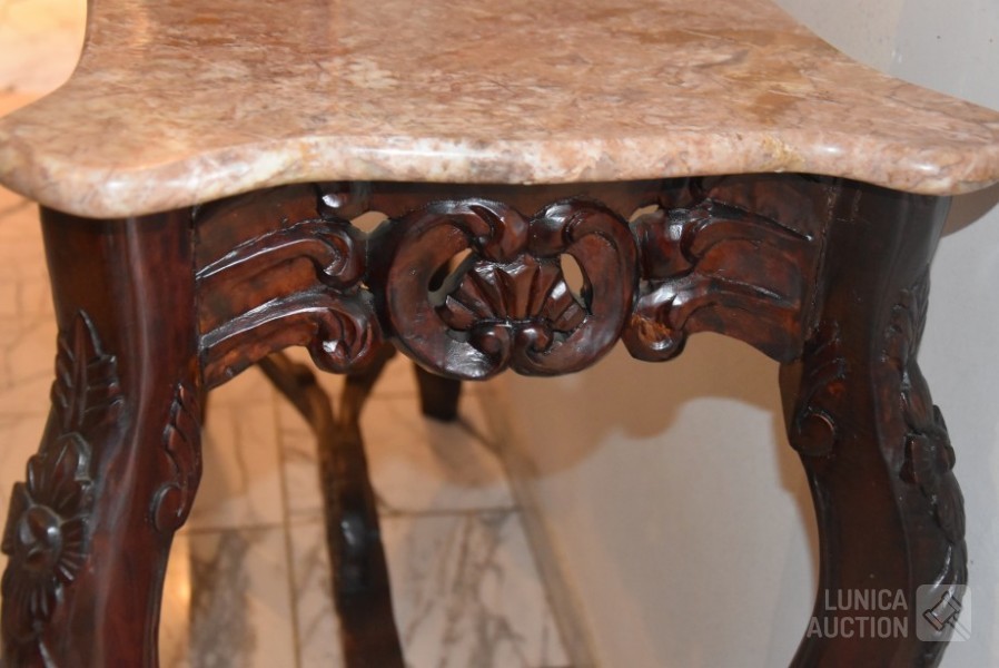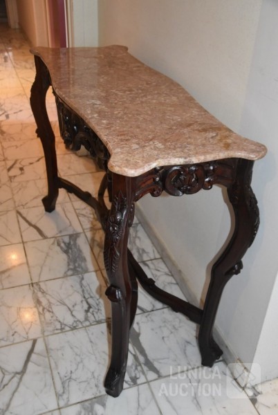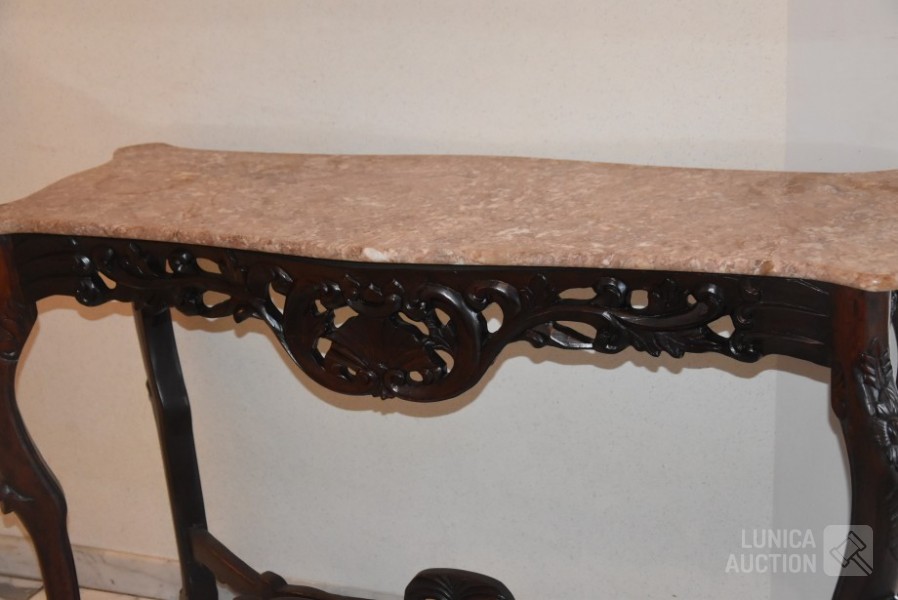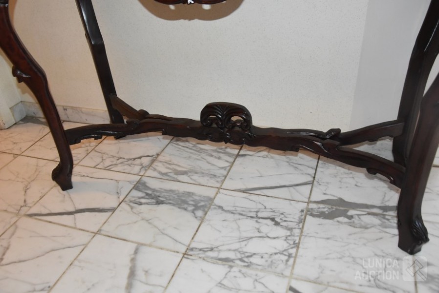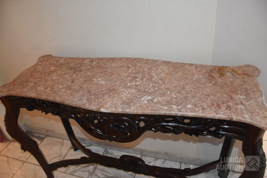 Afmeting (bxdxh) 125x47x87 cm. Houtsnijwerk, noten gekleurd