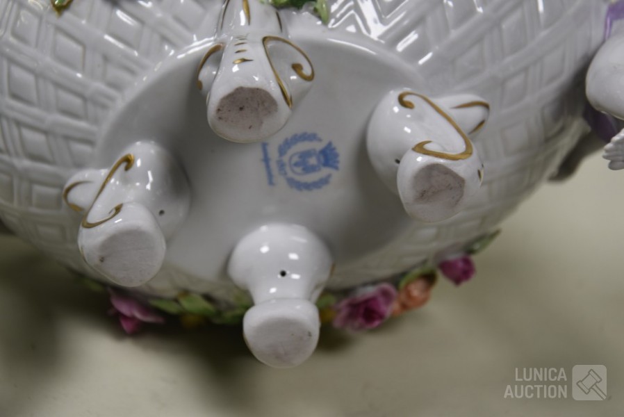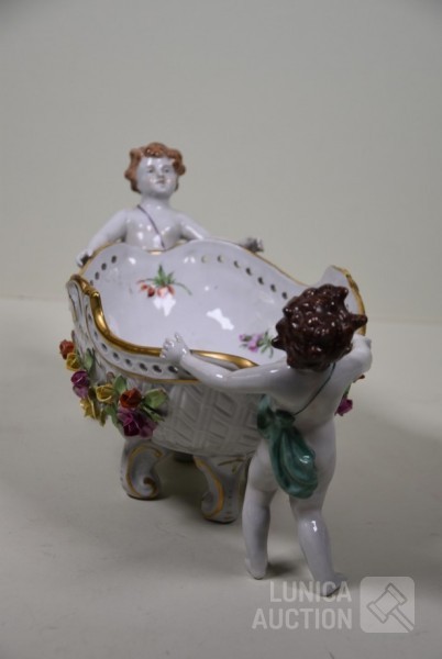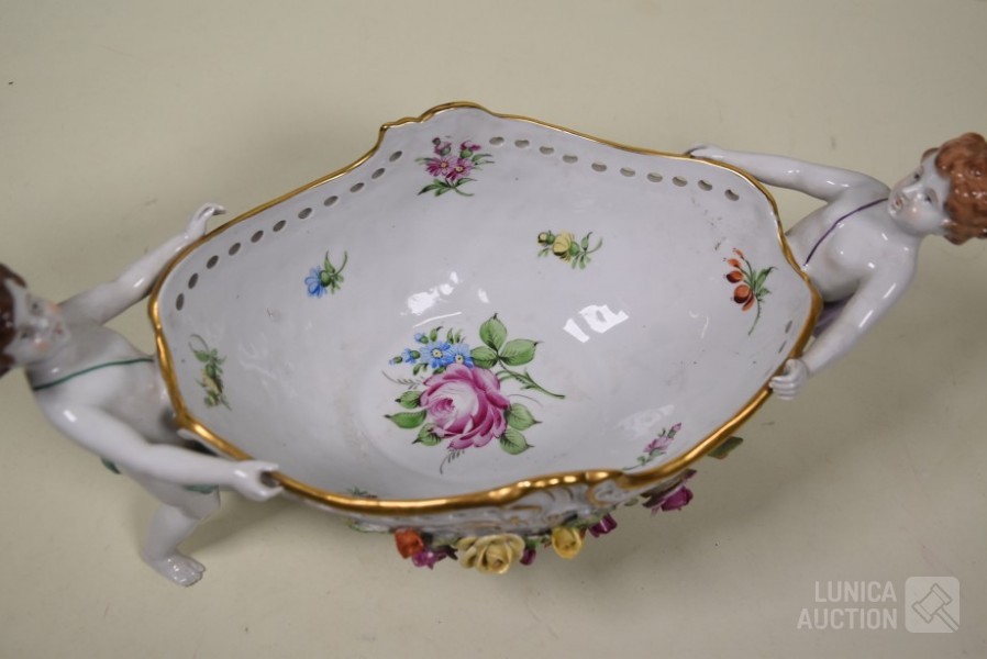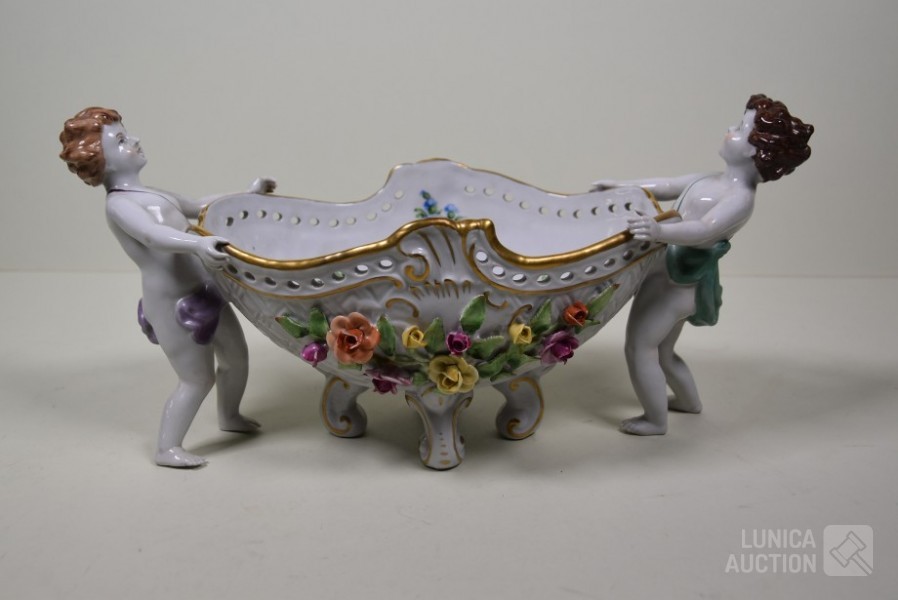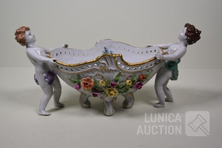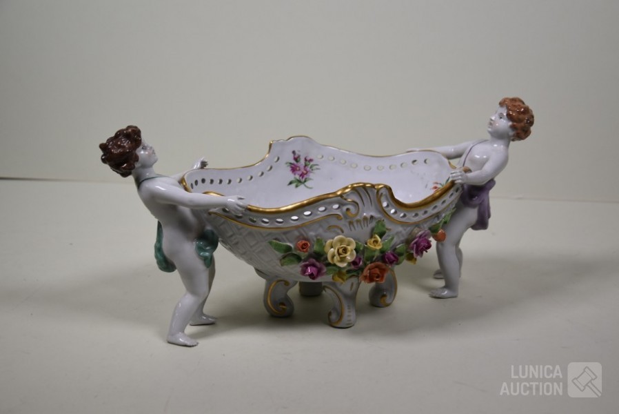 schaal met putti, in goede staat. Afmeting (bxdxh) 34x22x15 cm. Van 1 putti ontbreekt duim, niet storend.