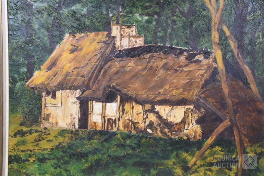 "huis met rieten dak", Afmeting 100x80 cm. Olieverf op doek gesigneerd R.O. Ingelijst, lijst zit los op een hoek