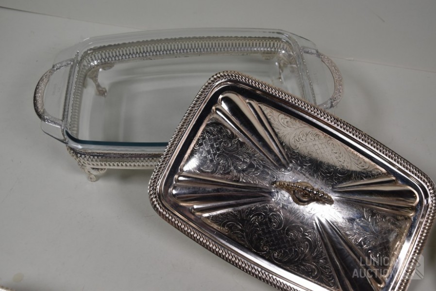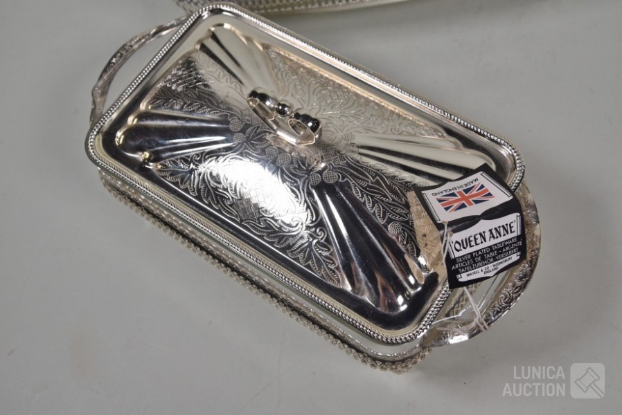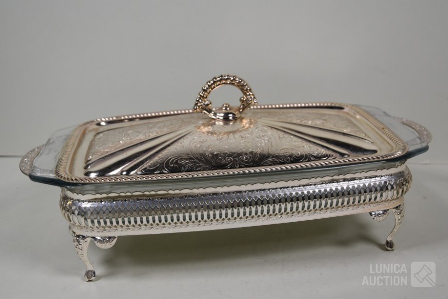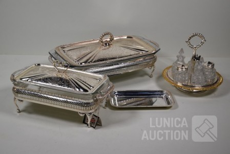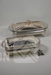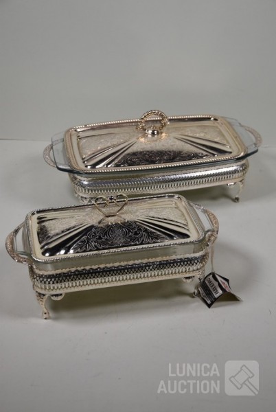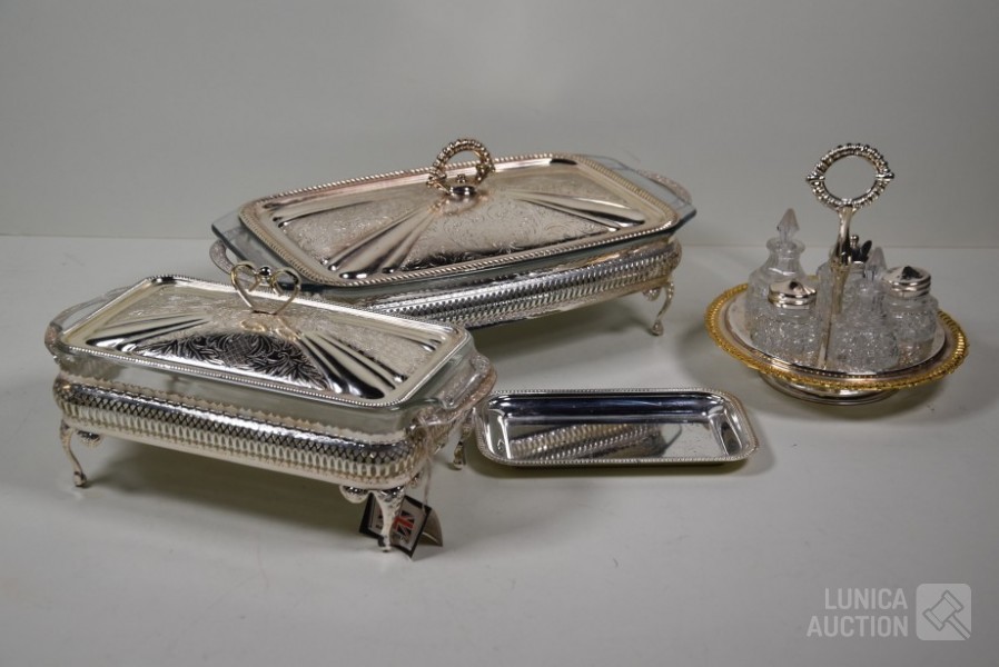 O.a. 2x rechaud in Queen Anne stijl, afmeting 16x32 cm en 20x38 cm. MAYELL&CO.; Peper en zoutstel. In zilverkleur, met speciaallak ingespoten metaal.