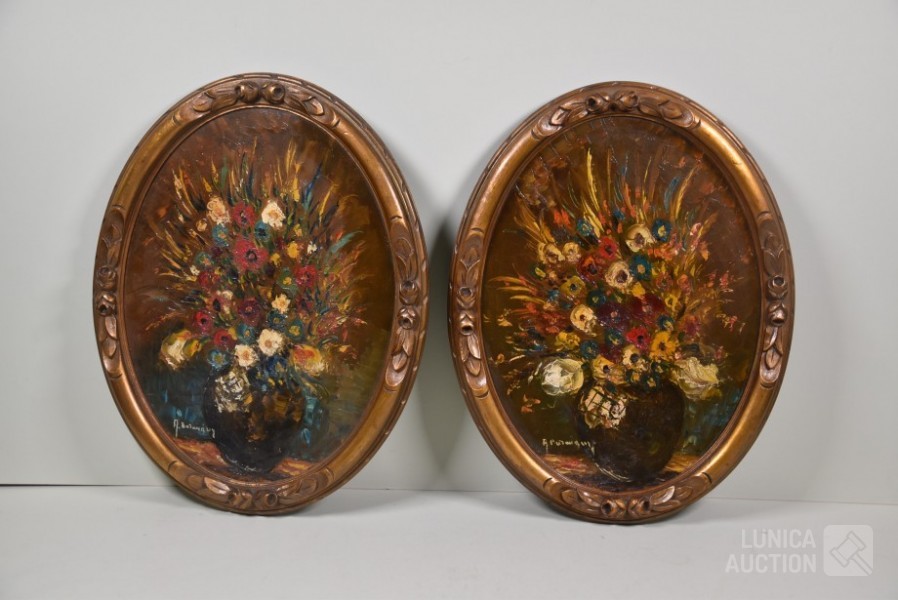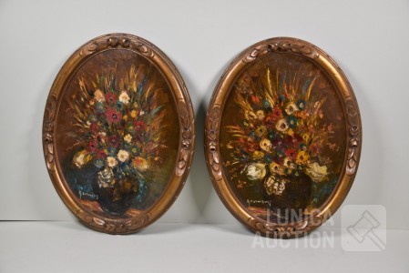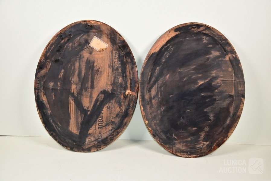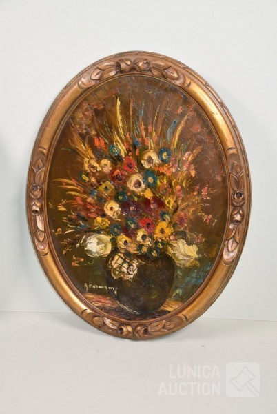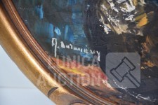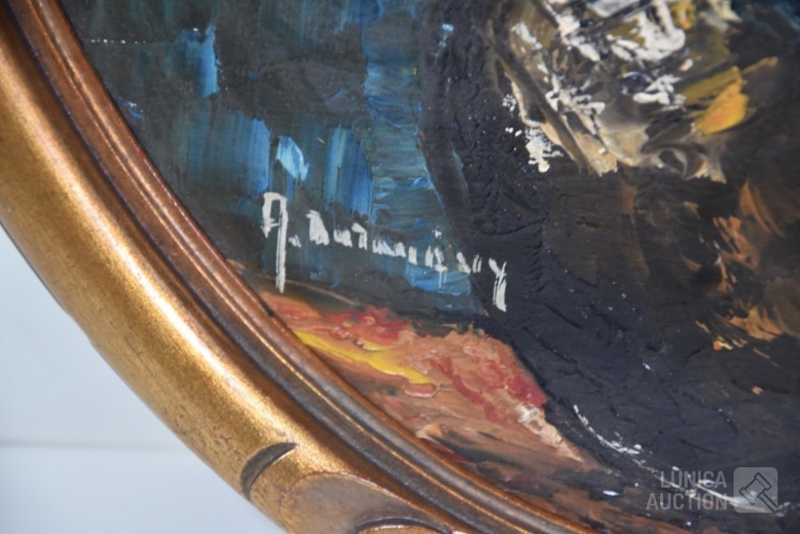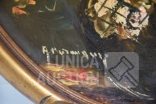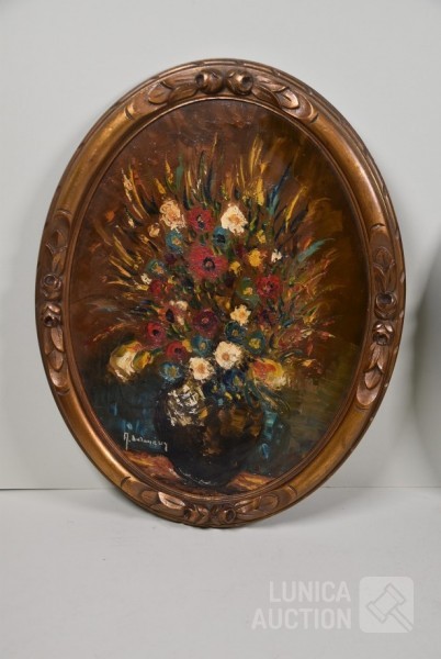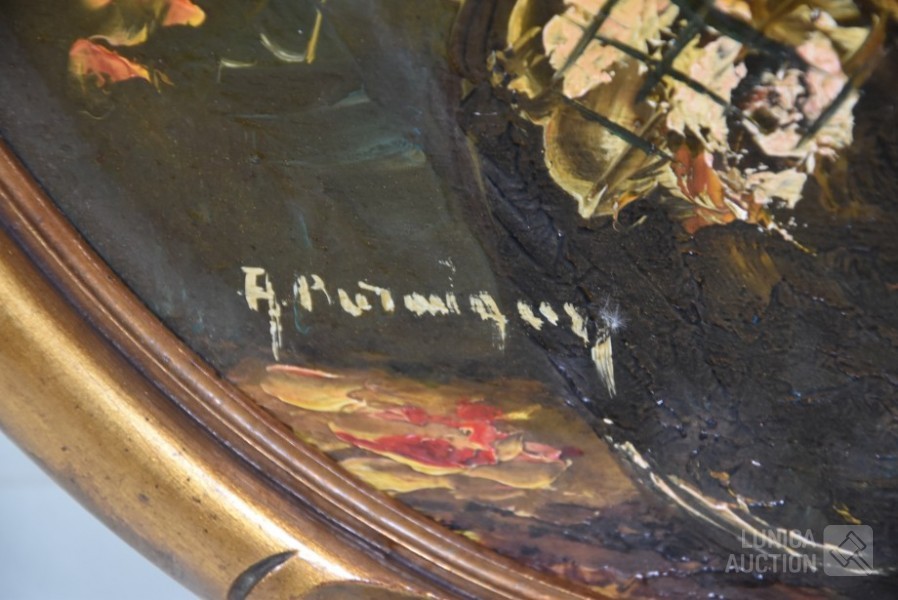 Olieverf op paneel in ovale lijst. Afmeting ca. 35x45 cm. Gesigneerd L.O.