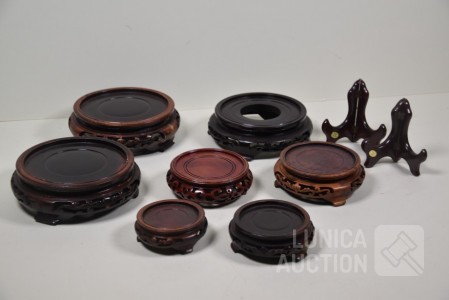 O.a.7x doorsnede 9cm/10cm/15cm/16cm/17cm; 2x kleine bordenstandaards, hoogte 10 cm. Meeste gemaakt van rozenhout.
