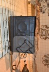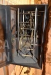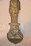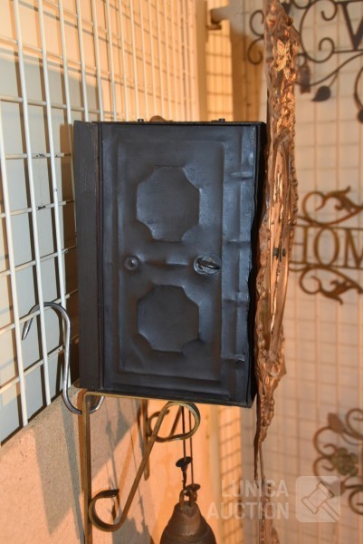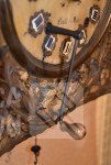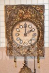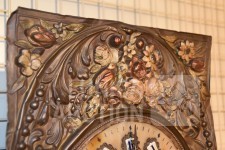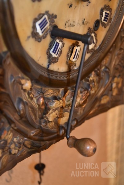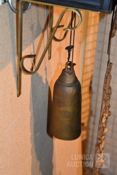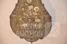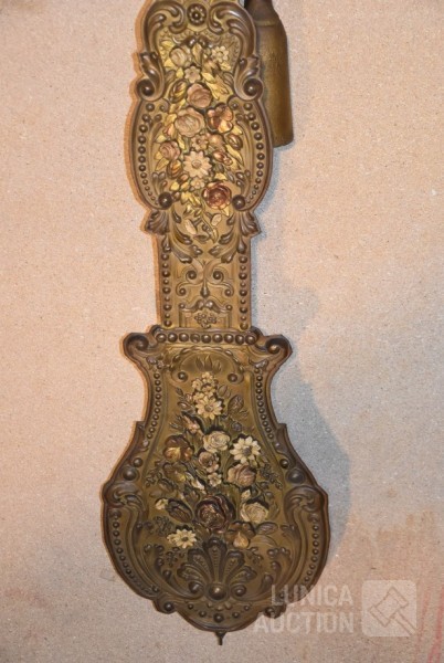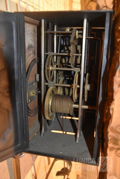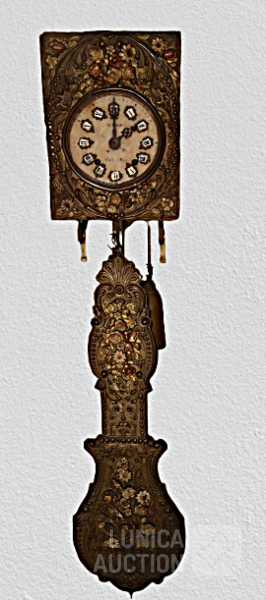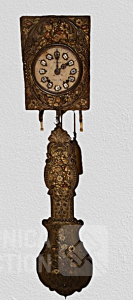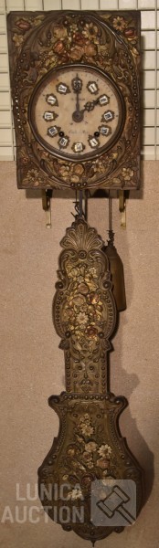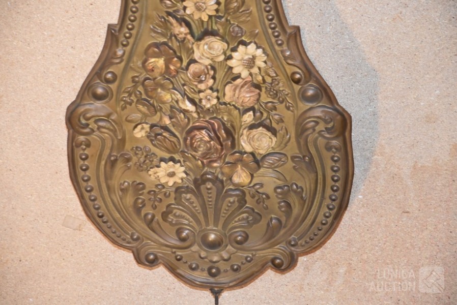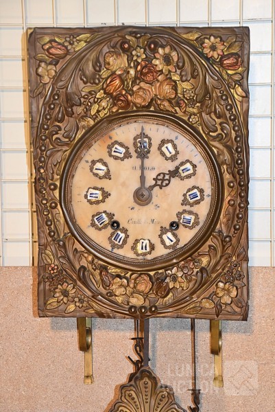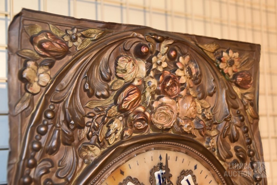 Met rozen gedecoreerde koperen comtoise klok met losse emaille cartouches, inclusief klokkenstoel en sleutel. Hoogte 145 cm, breedte 35 cm. Klok is niet getest.