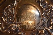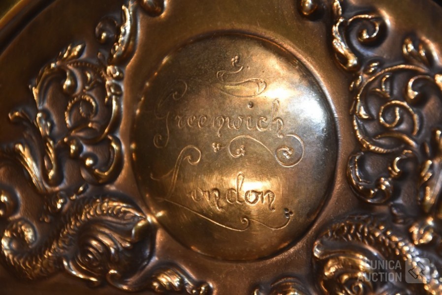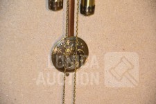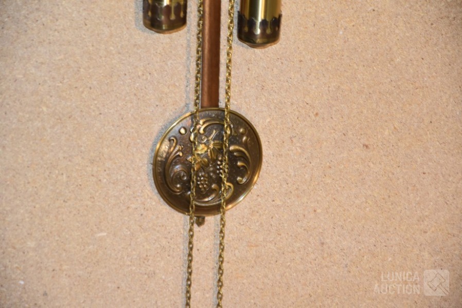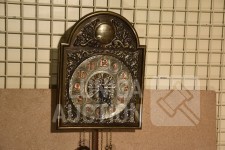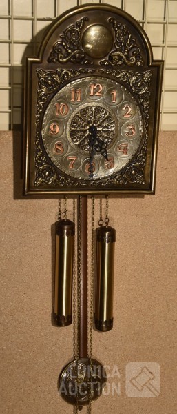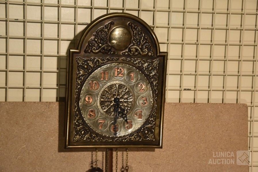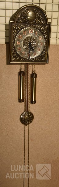 "Belcanto Greenwich klok", koper, met gong. Afmeting wijzerplaat 40x30 cm, hoogte met slinger 90 cm.