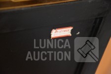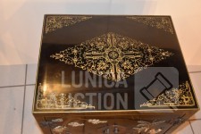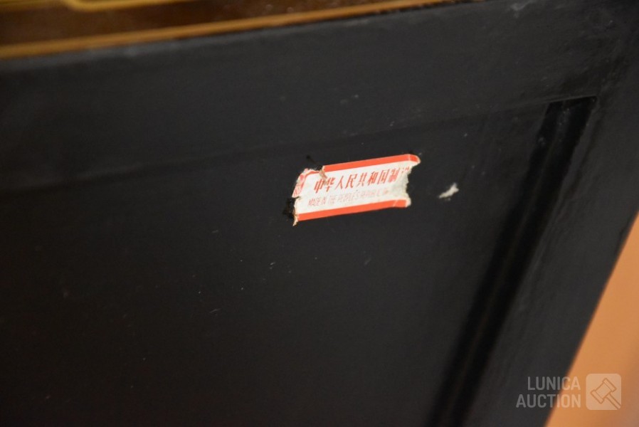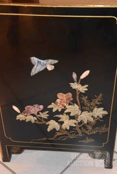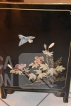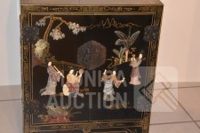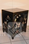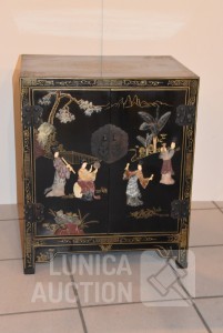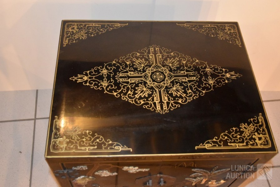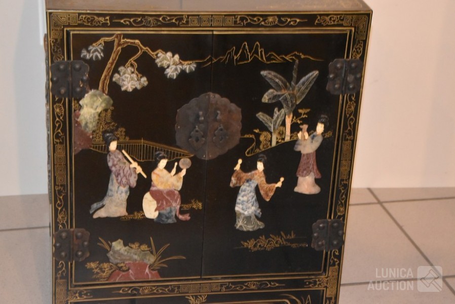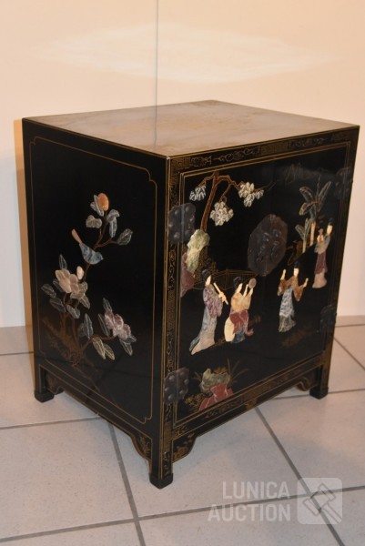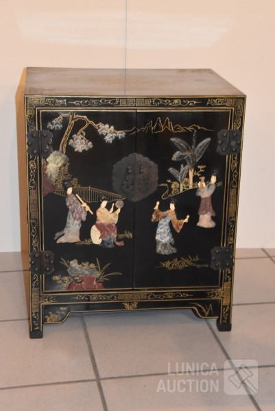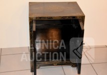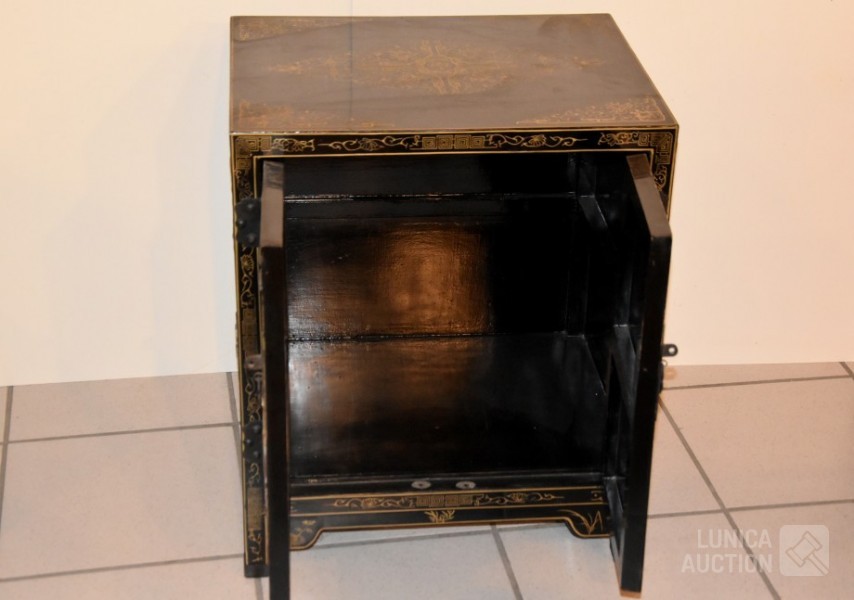 zwart gelakt, 2-deurs, koper beslag, handbeschilderd. Afmeting (bxdxh) 51x41x61 cm!