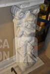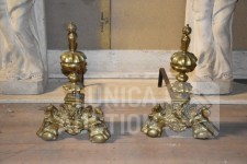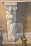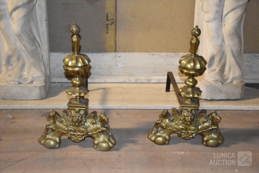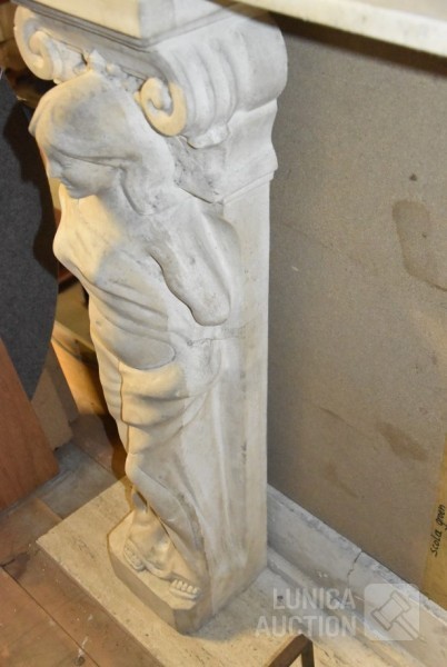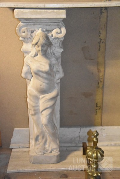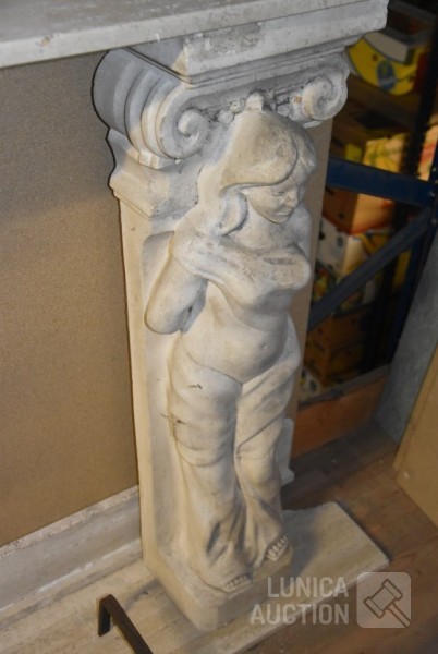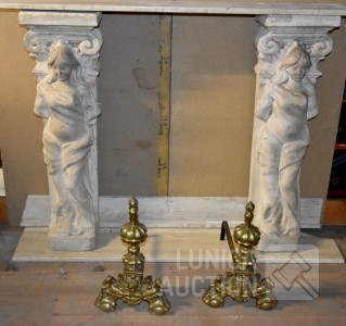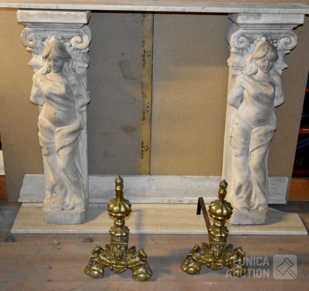 O.a. travertin platen en 2 zuilen (zandsteen) van vrouw figuren, afmeting 28x25x102 cm. Afmeting geheel ca. 130x108 cm Schouw is zelf aan te passen. Inclusief 2 haardijzers, 50cm diep, 45 cm hoog. In messing.