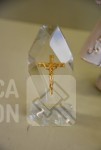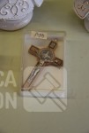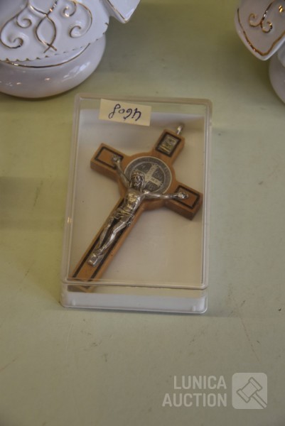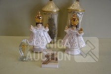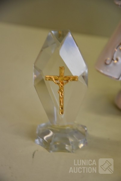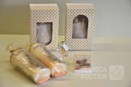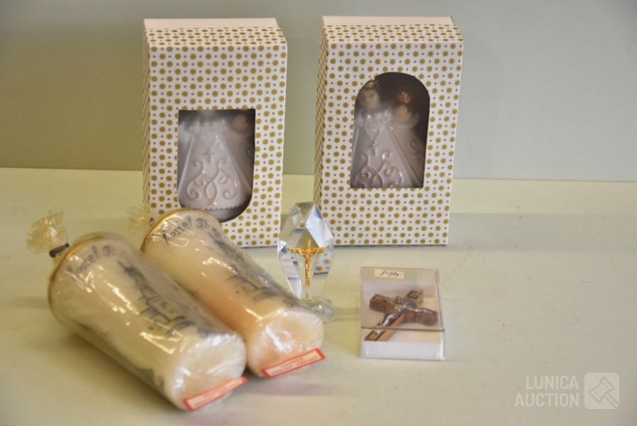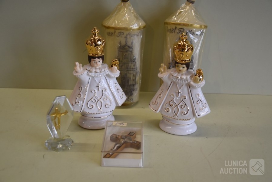 o.a. kleine crucifix hanger, lengte 7 cm; 2x porselein beeld Ce&Ce manufaktur, hoogte 14 cm; crucifix op geslepen glas, hoogte 8 cm; 2x kaars, hoogte 17 cm, "Postel P Marie Vitez, Praag"