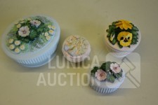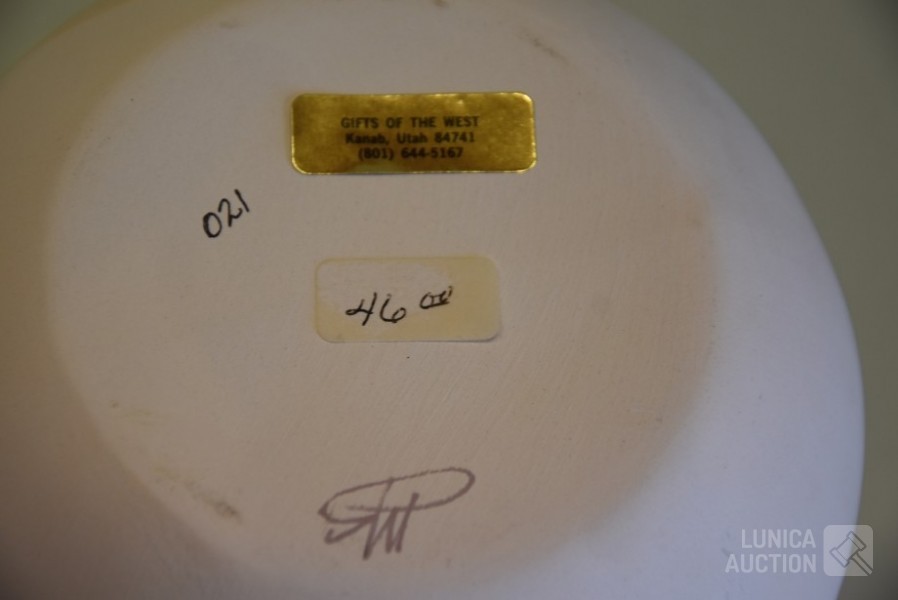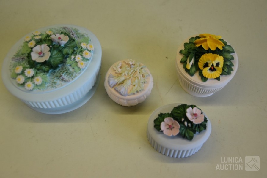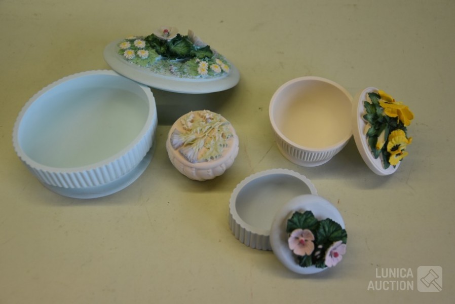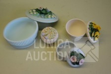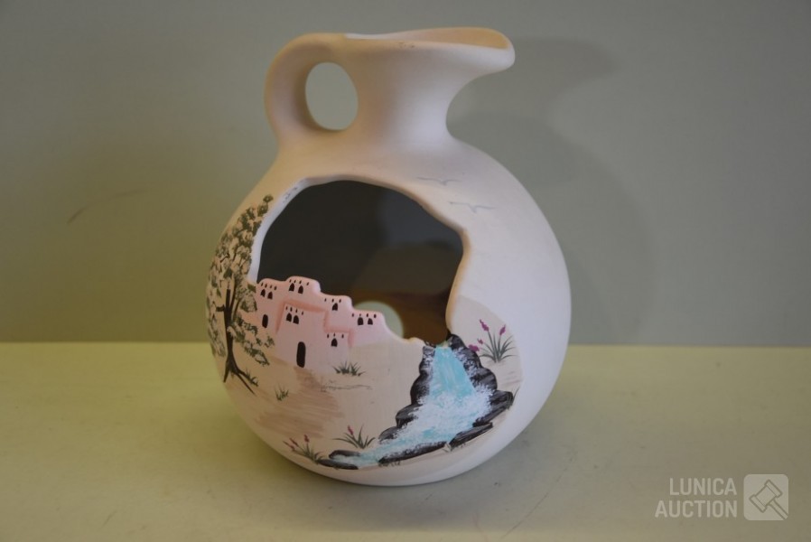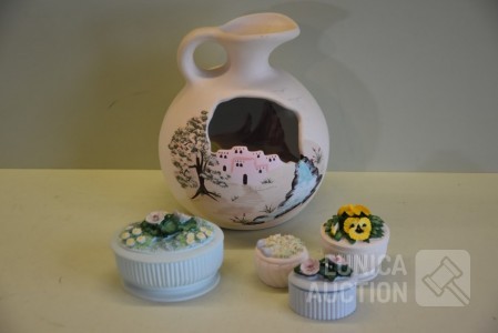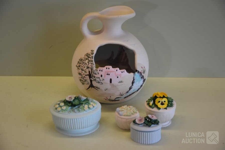 o.a. 4 opbergdoosjes, hoogte variërend van 3 cm tot 6 cm; Vaas, Afkomstig van "Gifts of the West Kanab, Utah", handbeschilderd aardewerk in inheemse stijl.