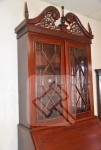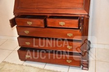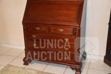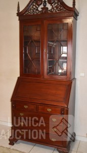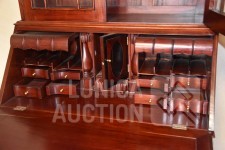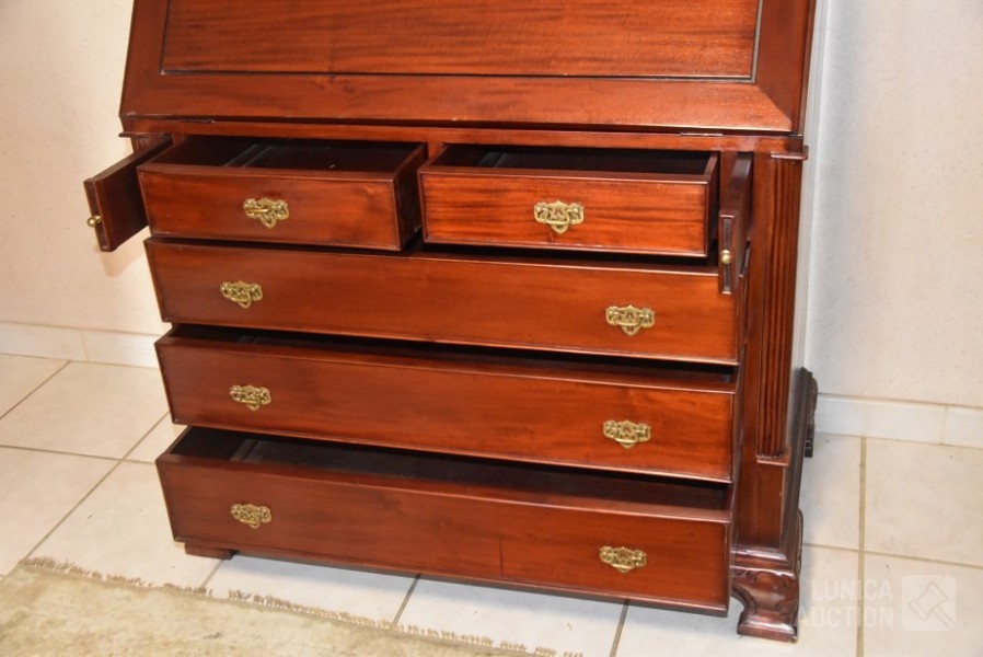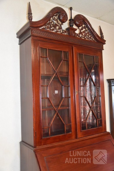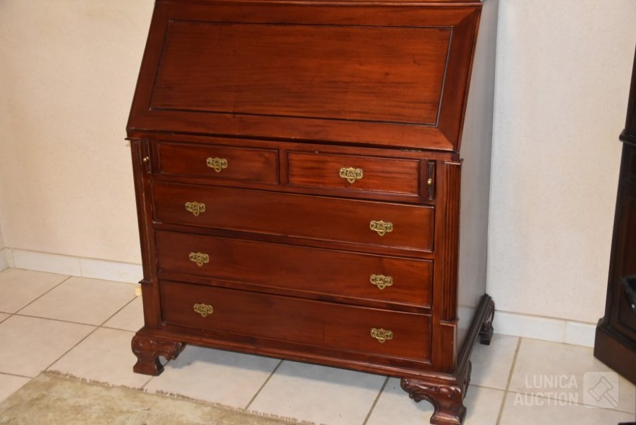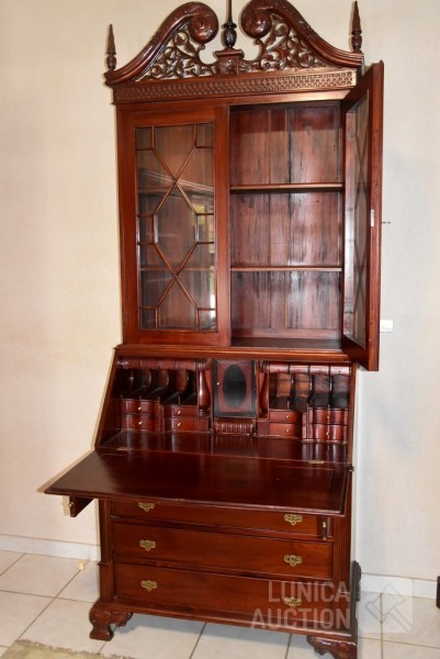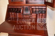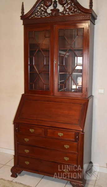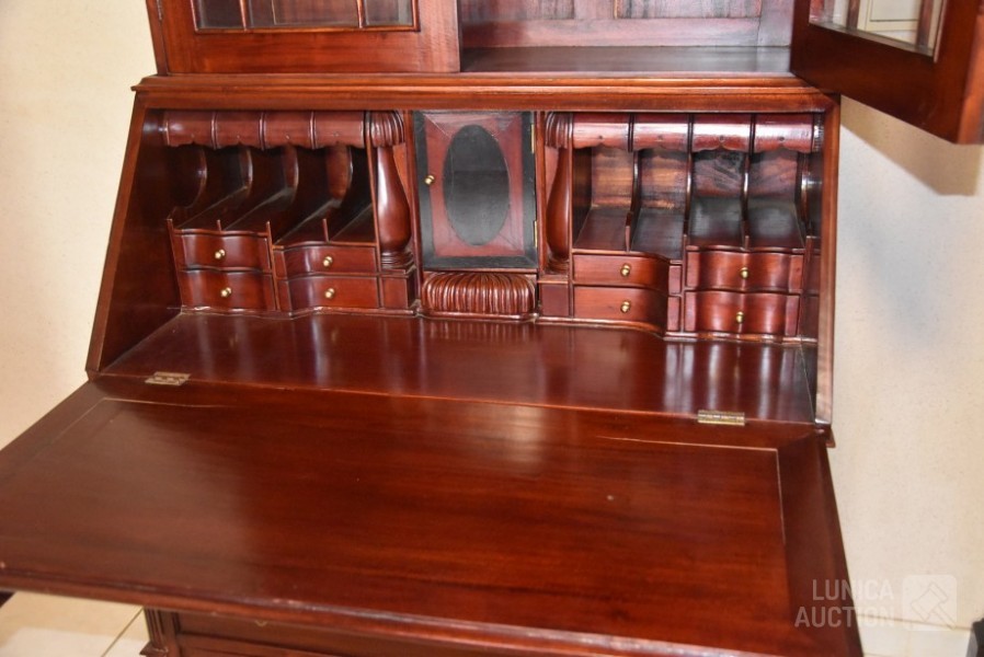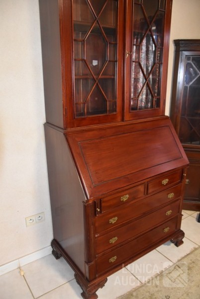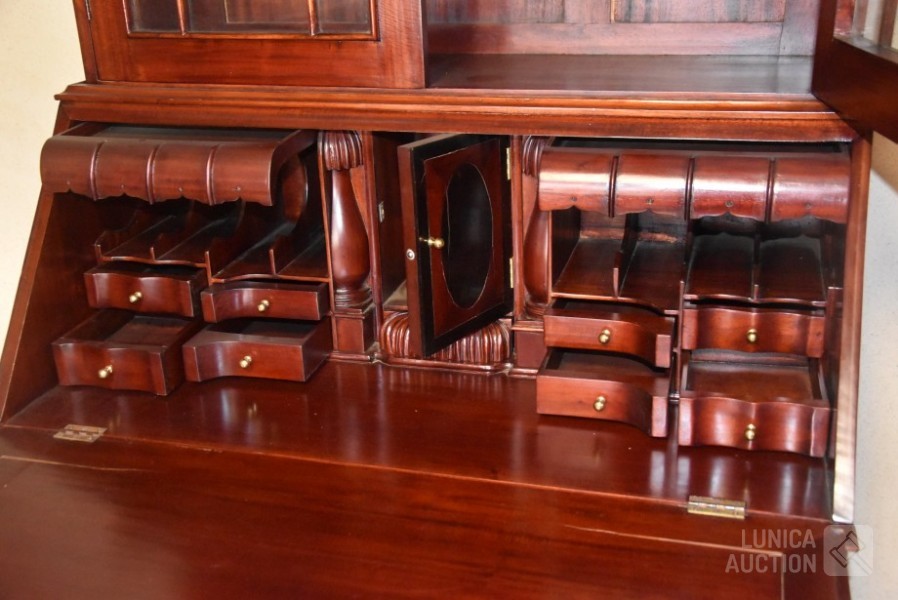 In bureau gedeelte zitten 14 (deels verborgen) laden of opbergvakken. Notenhout/deels notenhout gekleurd. Kast is 2-delig. Afmeting (bxdxh) 100x58x242 cm. Kast heeft mooie uitstraling.