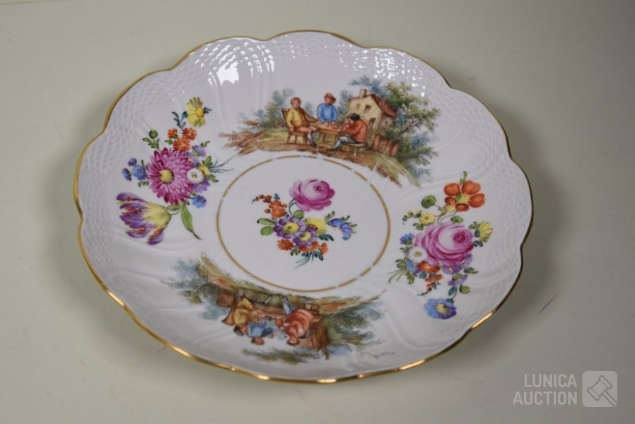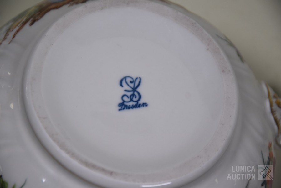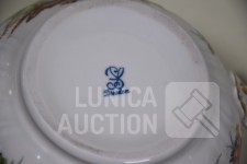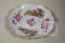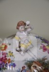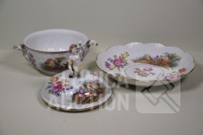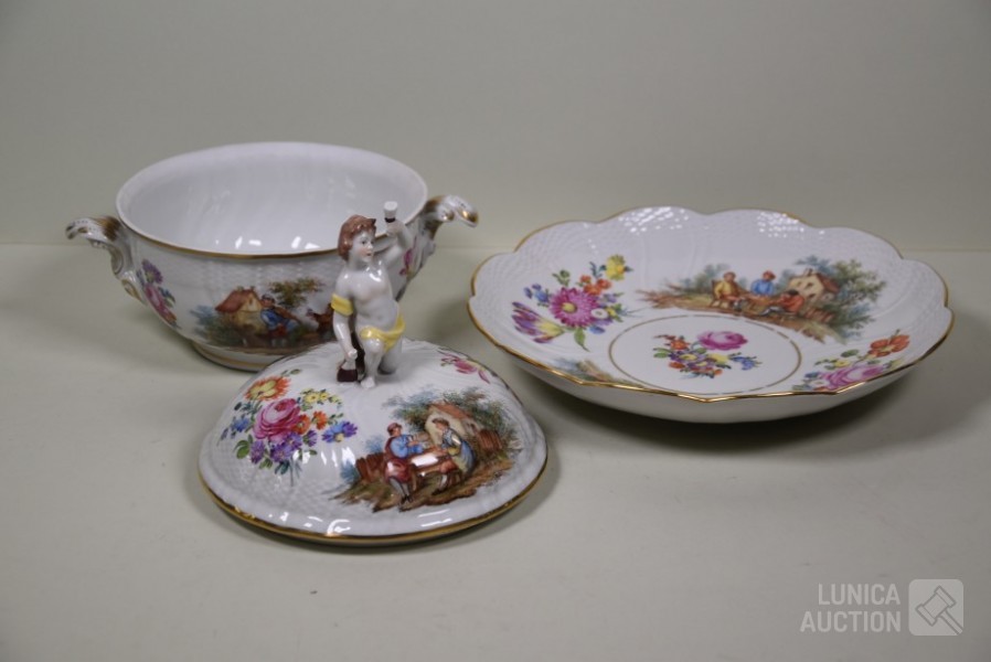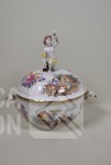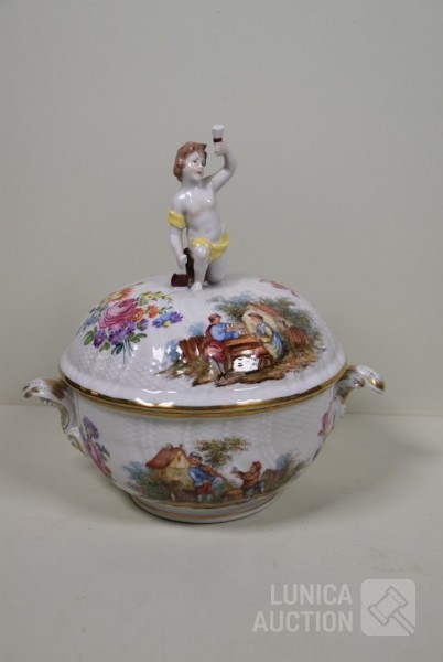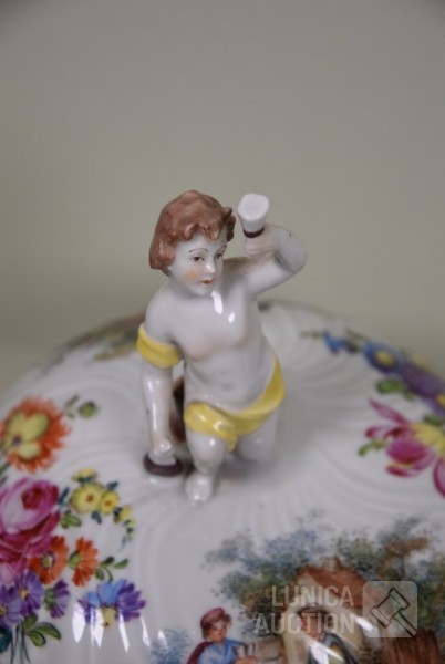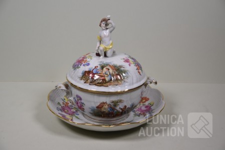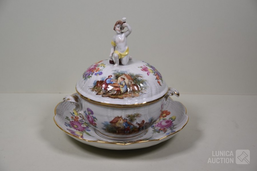 Knop in de vorm van putti. Met goud vergulding. Terrine met deksel, hoogte 23 cm, doorsnede 22 cm. Onderschotel doorsnede 26 cm.
