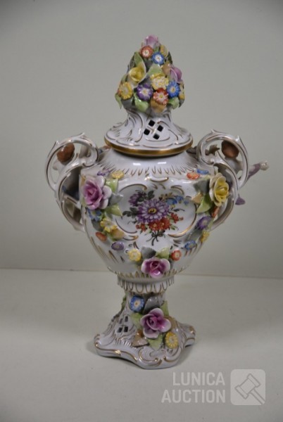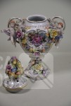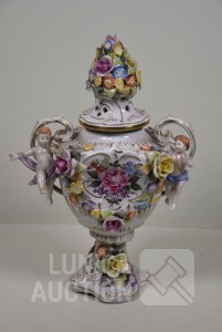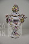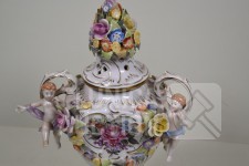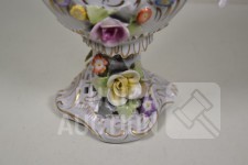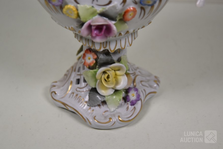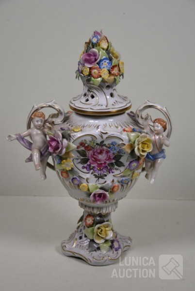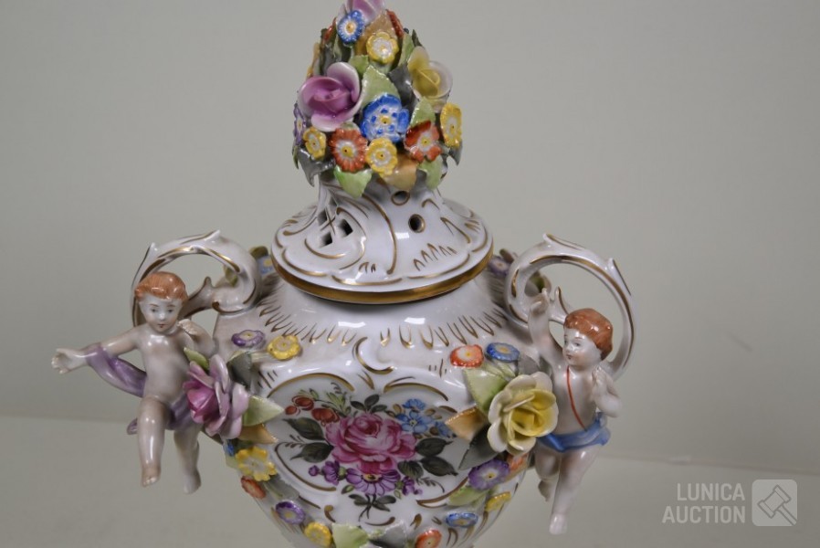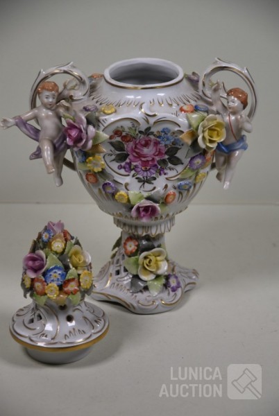 Vaas met putti en floraal decor, handbeschilderd. Afmeting (bxh) 23x32 cm. In goede staat.