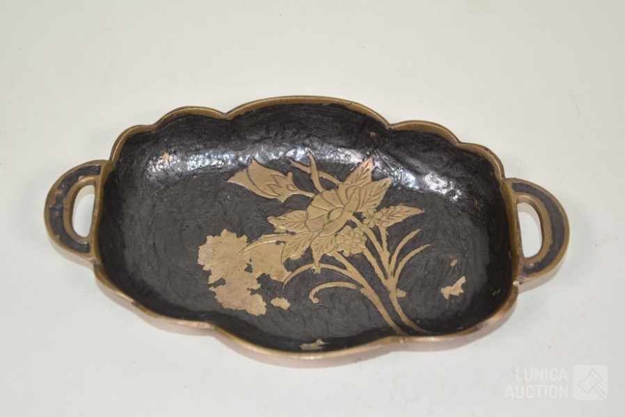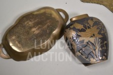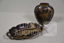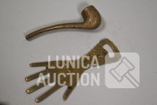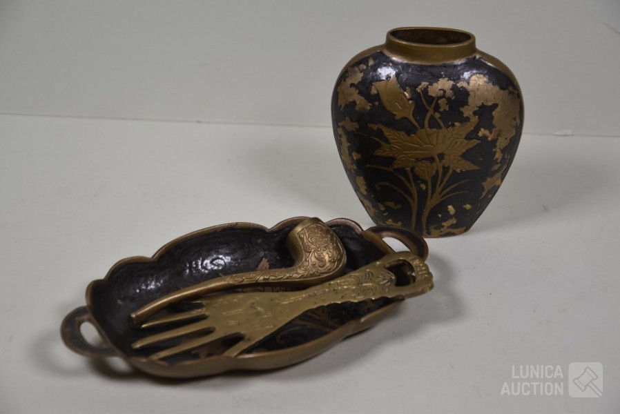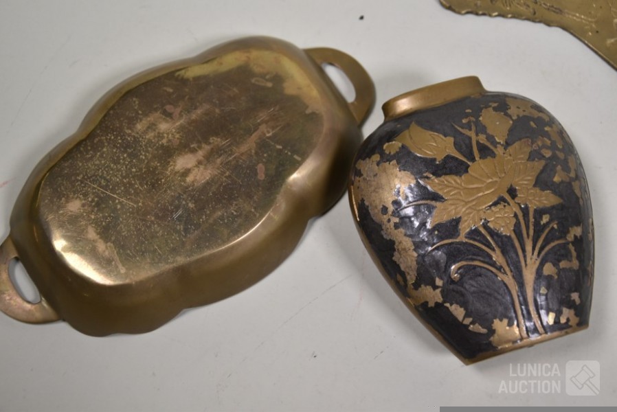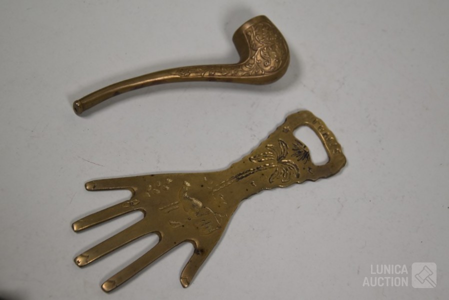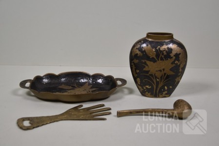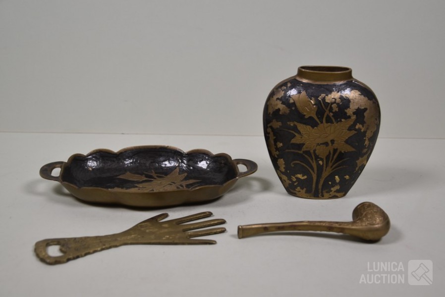 O.a. vaas, afmeting 14x11 cm.; Schaal 22x13 cm; Pijp; Flesopener. Allen geelkoper. Zwarte verf van vaasje heeft deels losgelaten.
