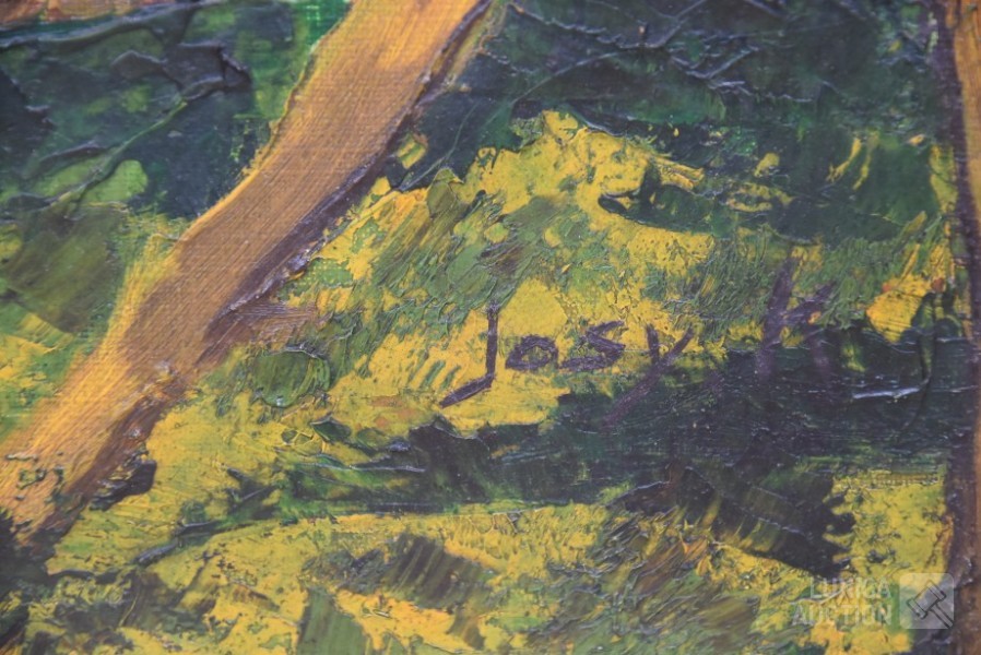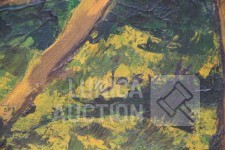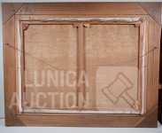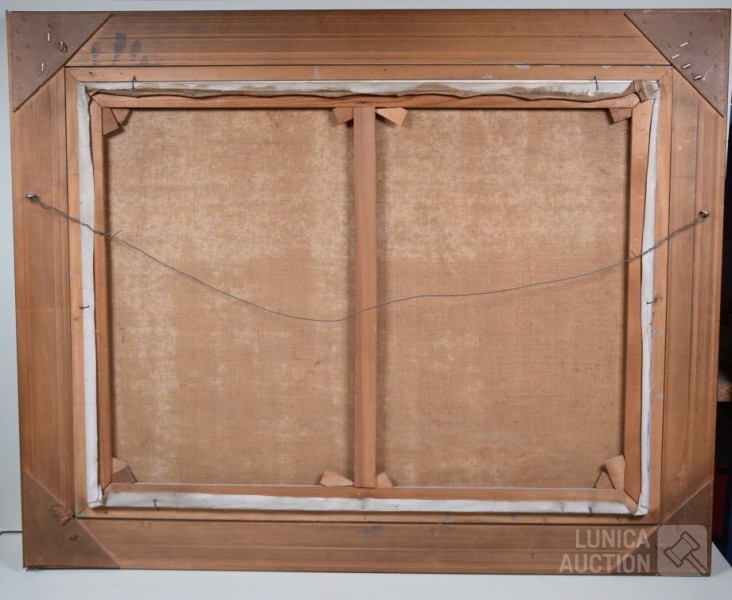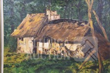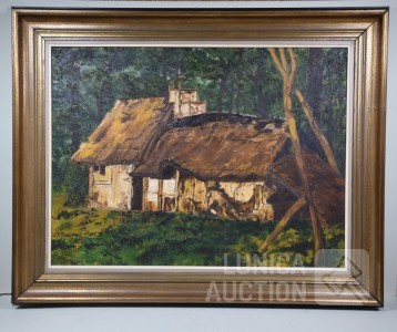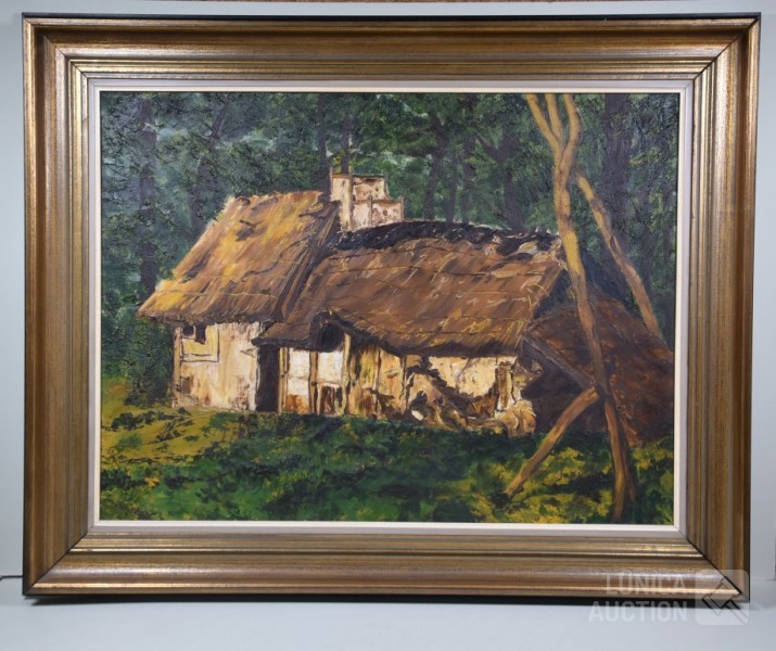 "huis met rieten dak", Afmeting 100x80 cm. Olieverf op doek gesigneerd R.O. Ingelijst, lijst zit los op een hoek