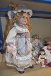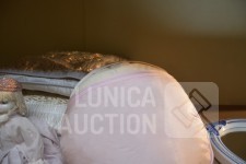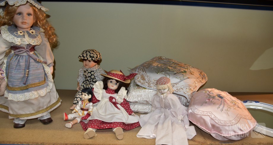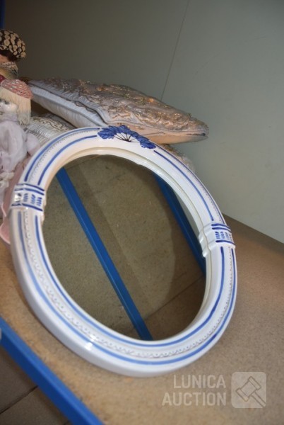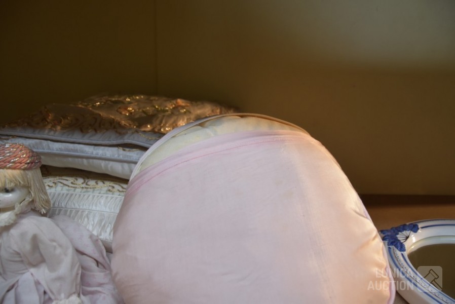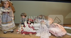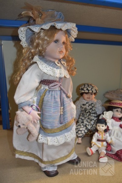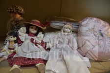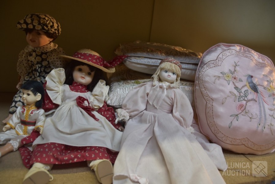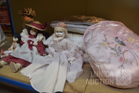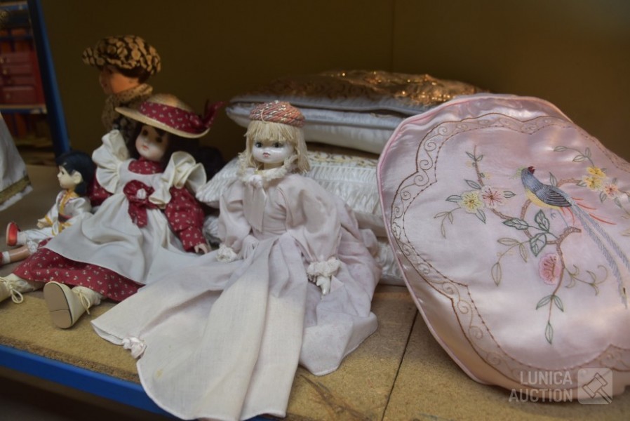 O.a poppen, hoogte 30 cm/35 cm/55 cm; Kussens 40x40 cm met gouddraad; Spiegel Herbeau, hoogte cm; enz. Items kunnen gebruikerssporen hebben.