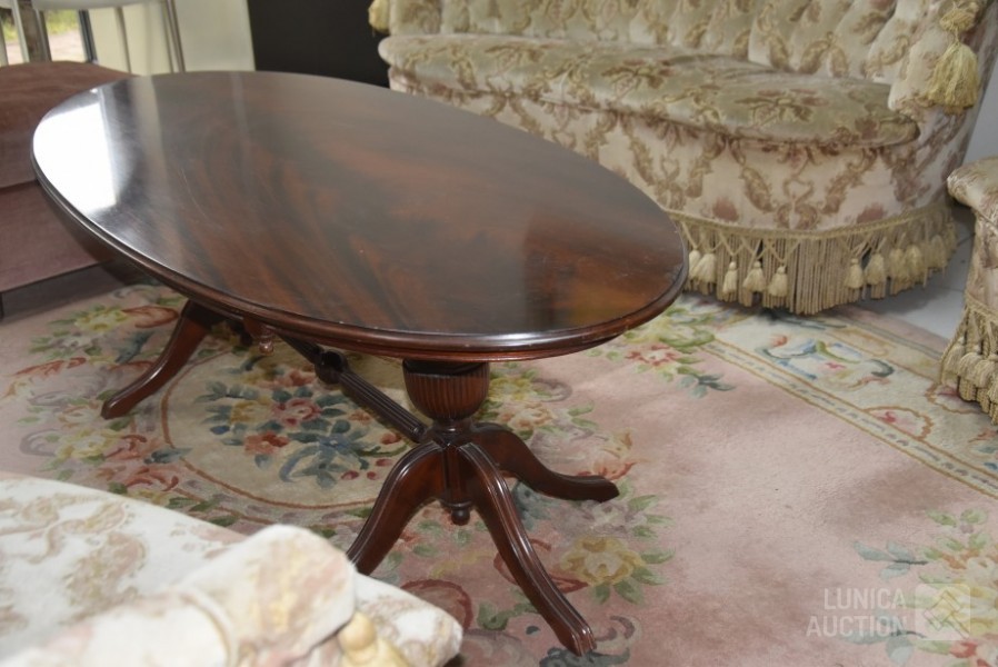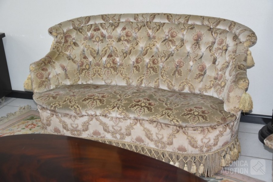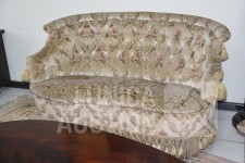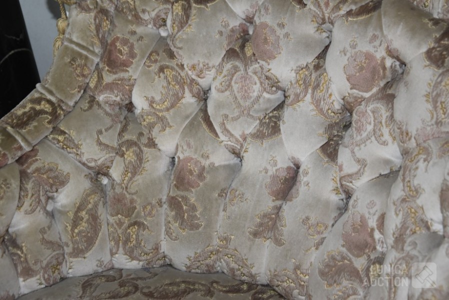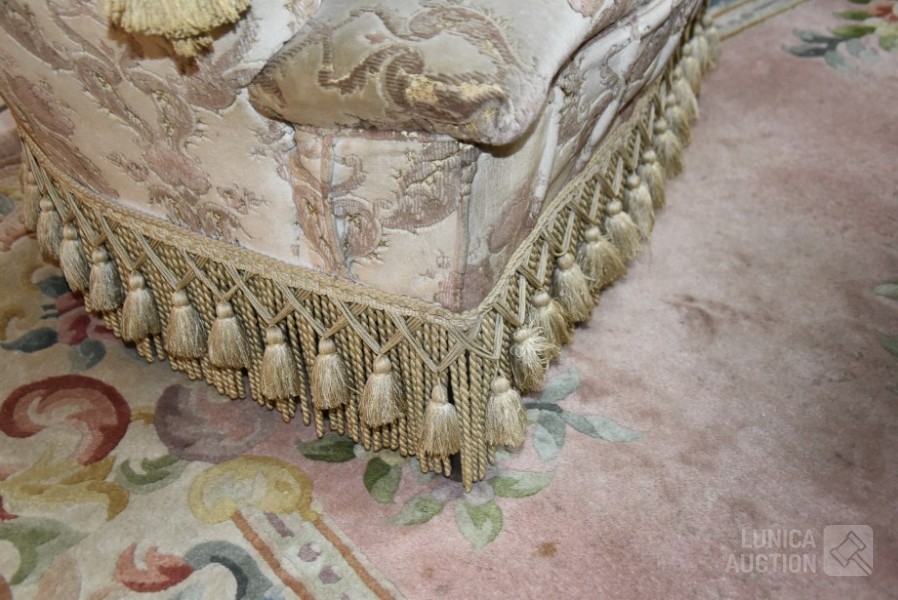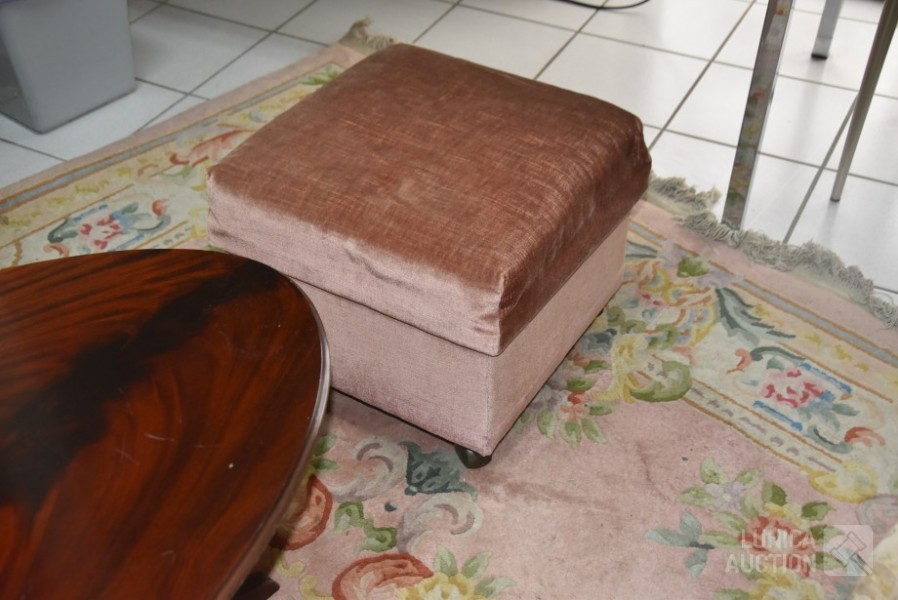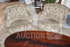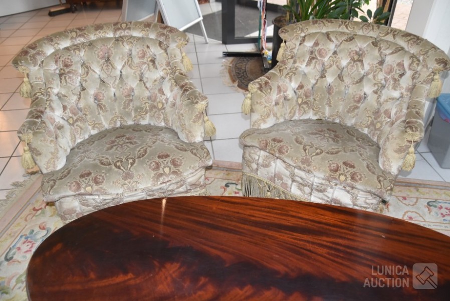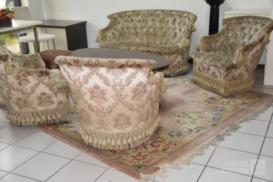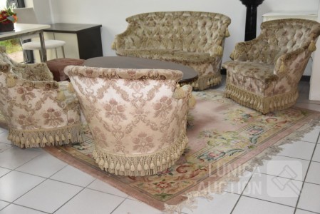 3 fauteuils, afmeting 80x75x80 cm; 2-zits bank 143x82x82 cm; Salontafel 65x140x47 cm; Hocker, 48x48x40 cm. Met gebruikerssporen.