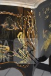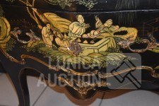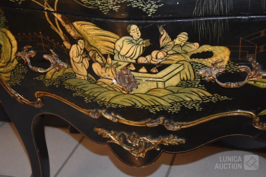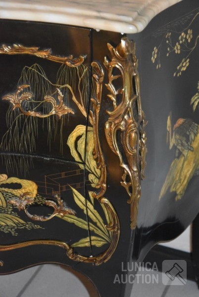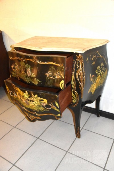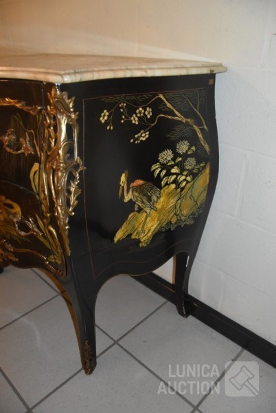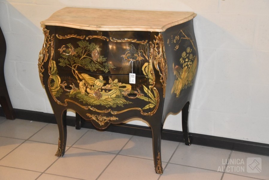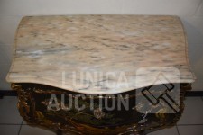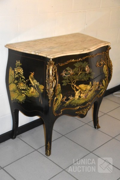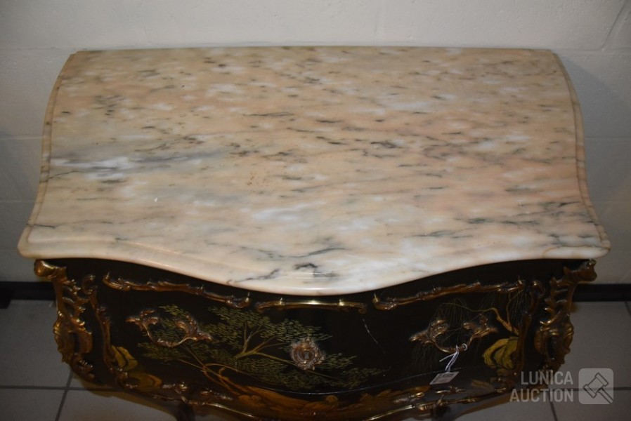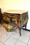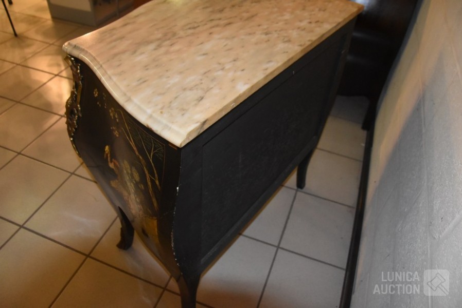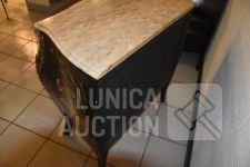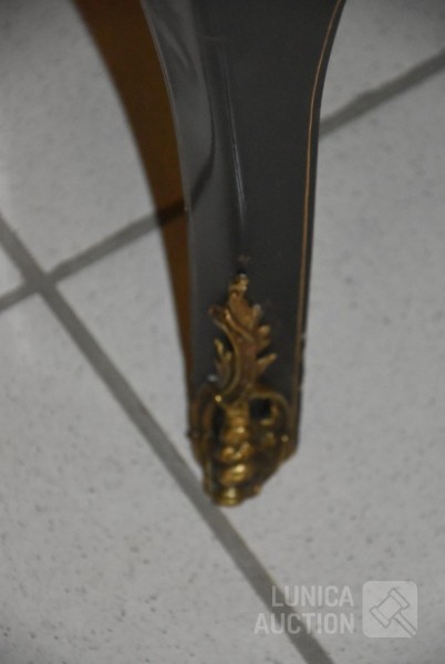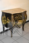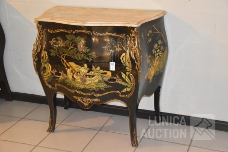 Natuursteen bovenblad van 2 cm, handbeschilderd. Afmeting 85x50x85 cm. De decoratie is geguts en daarna beschilderd. Lichte gebruikerssporen.