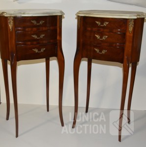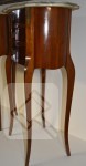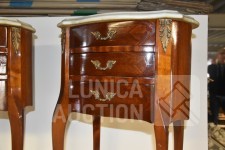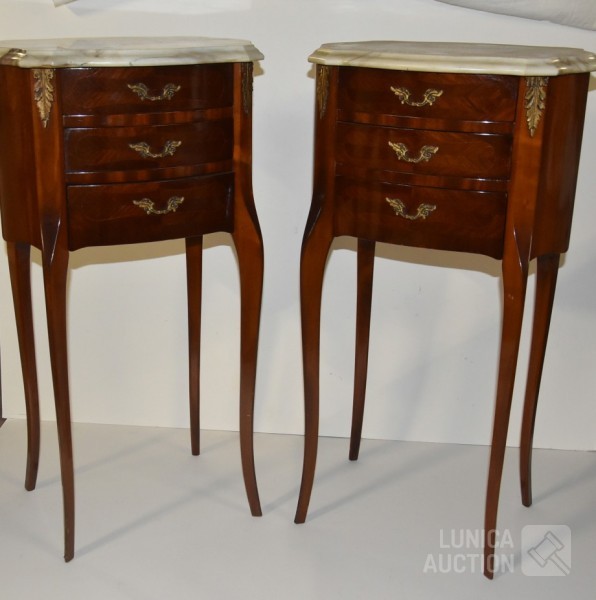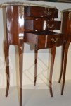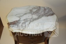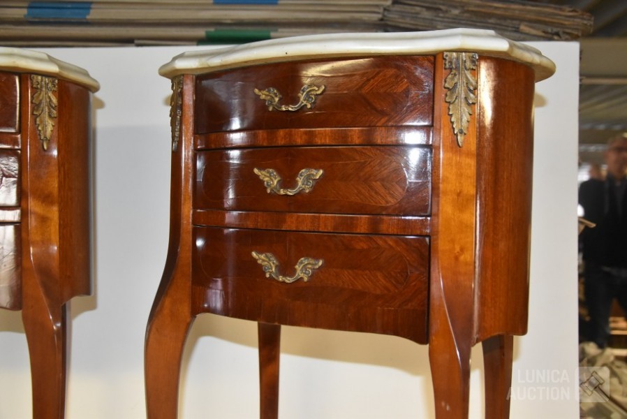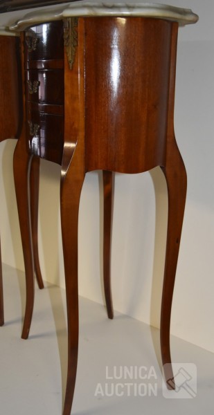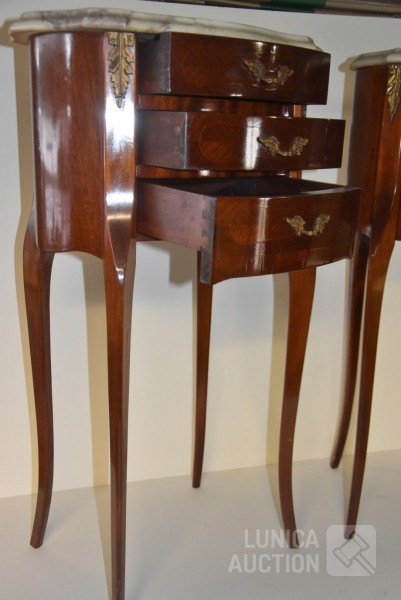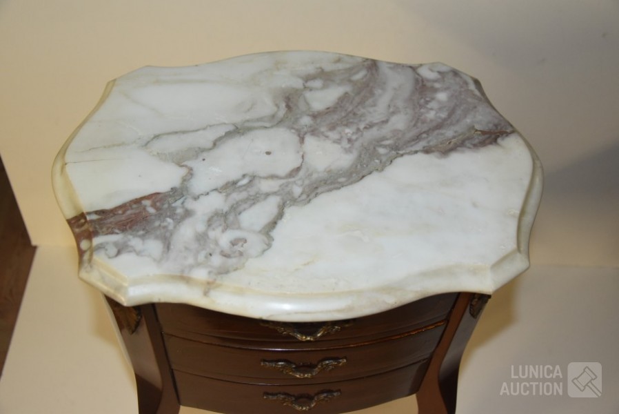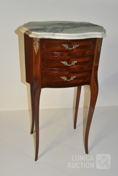 Met marquetterie en natuursteen bovenblad. Messing beslag. In Lodewijk XV Stijl. Afmeting 40x28x73 cm.