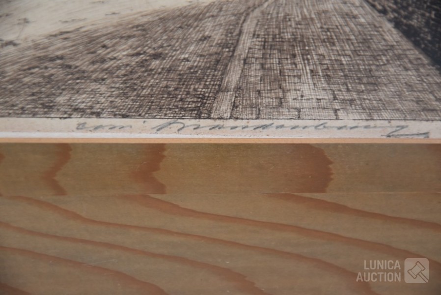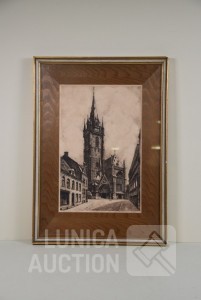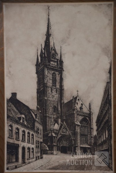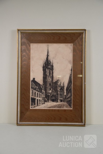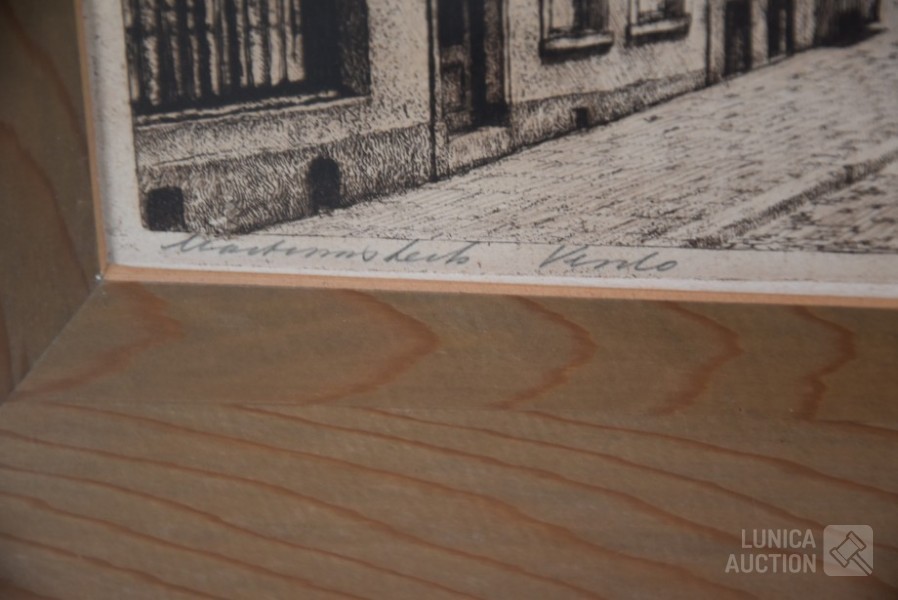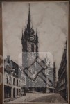 "Martinuskerk van Venlo", ingelijst, achter glas. Afmeting 43x60 cm. Met potlood handgesigneerd R.O.