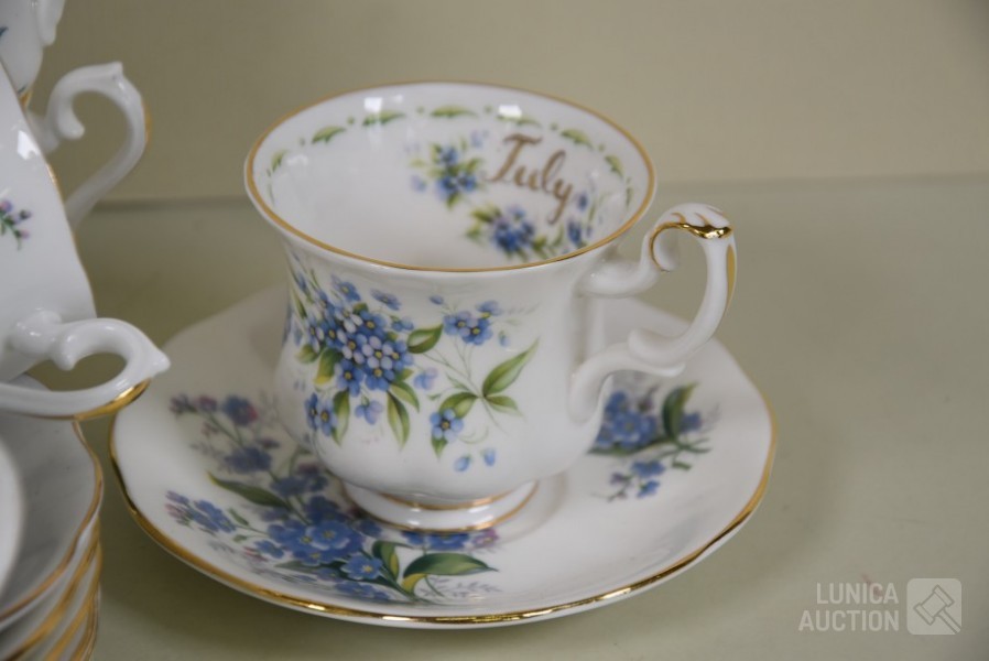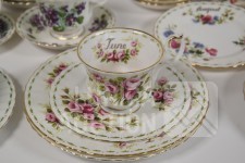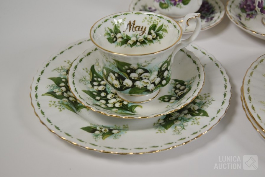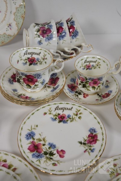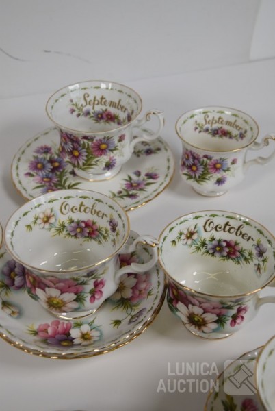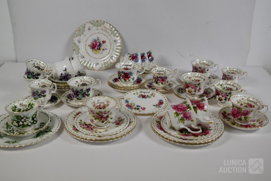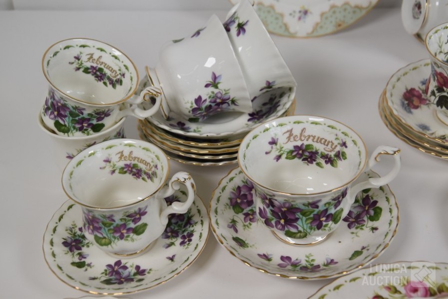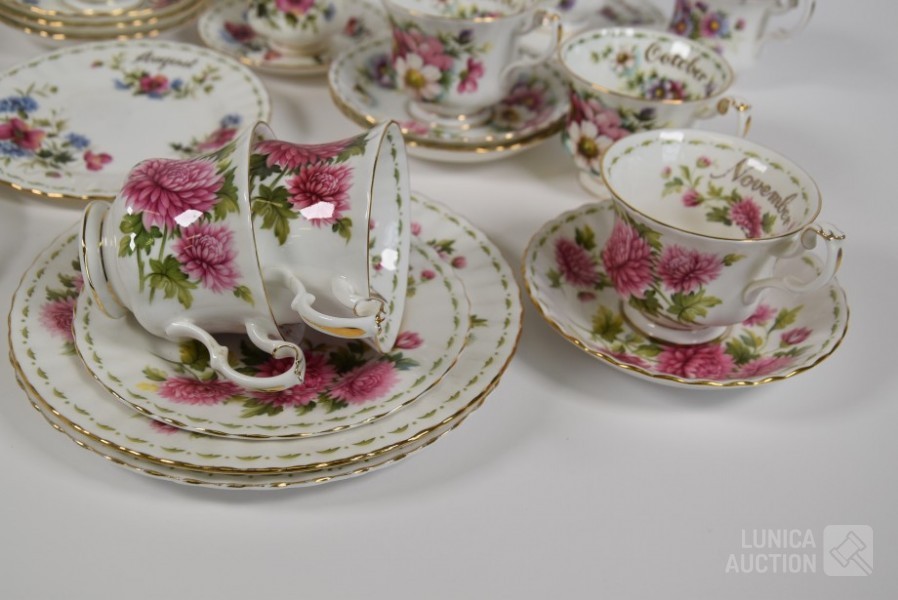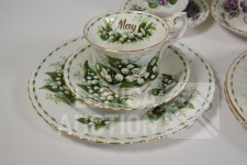 O.a. 11x decor "poppy"; 7x decor "chrysanthemum"; 12x decor "violets"; 3x decor "cosmos"; 4x decor "Roses"; 3x decor "lily of the valley"; 3x decor "michaelmas daisy"; 1x "happy Birthday". Het betreft hier kop en schotels en gebaksborden, maanduitgave zoals September, Juni November, Augustus enz.