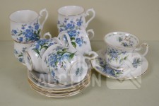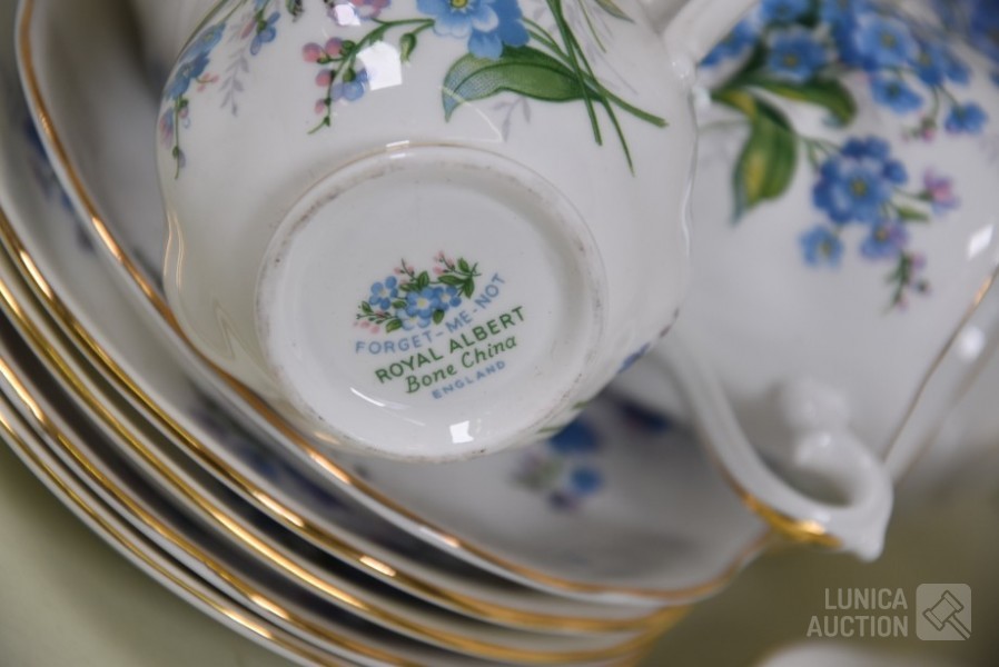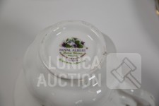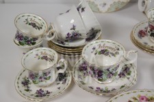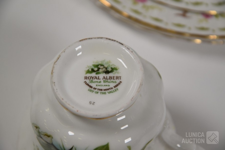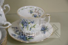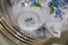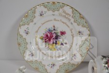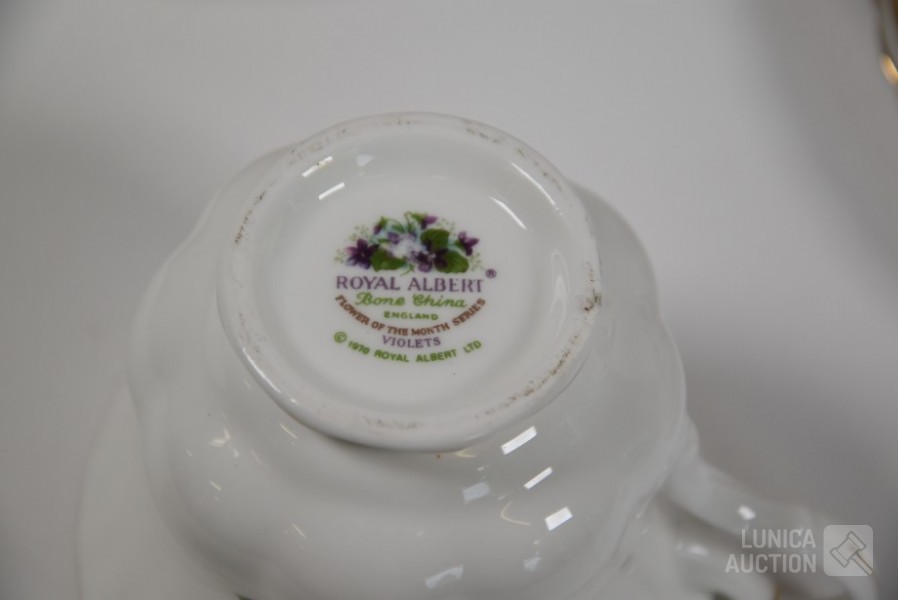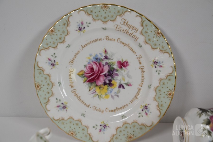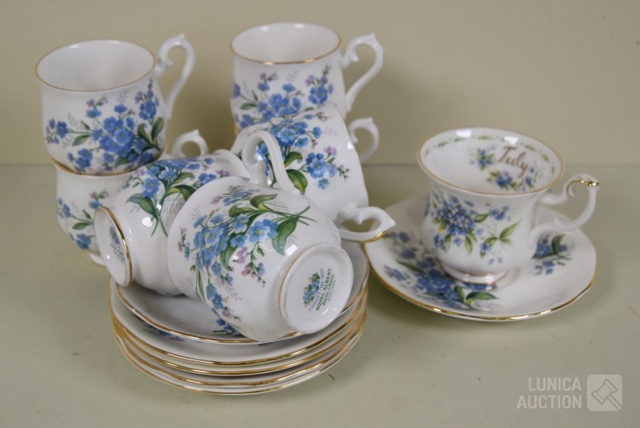 O.a. 11x decor "poppy"; 7x decor "chrysanthemum"; 12x decor "violets"; 3x decor "cosmos"; 4x decor "Roses"; 3x decor "lily of the valley"; 3x decor "michaelmas daisy"; 1x "happy Birthday". Het betreft hier kop en schotels en gebaksborden, maanduitgave zoals September, Juni November, Augustus enz.