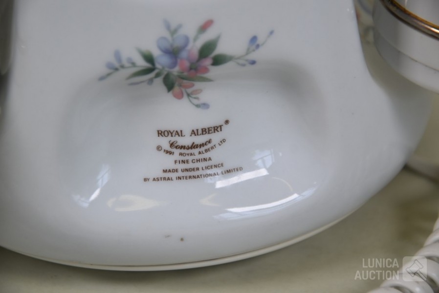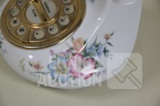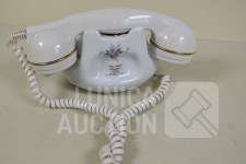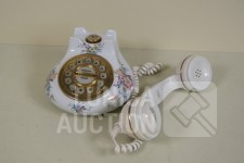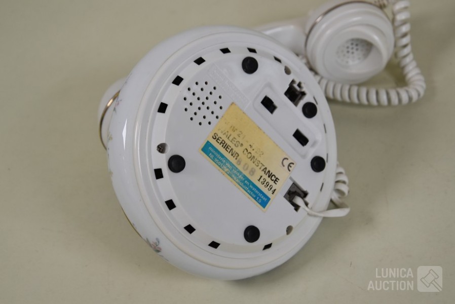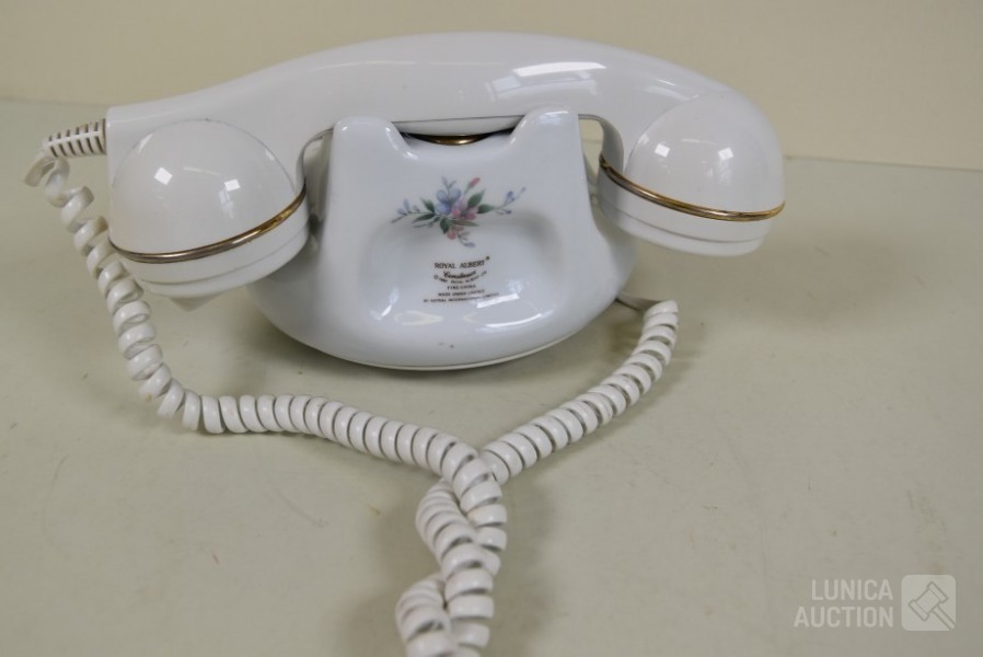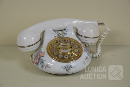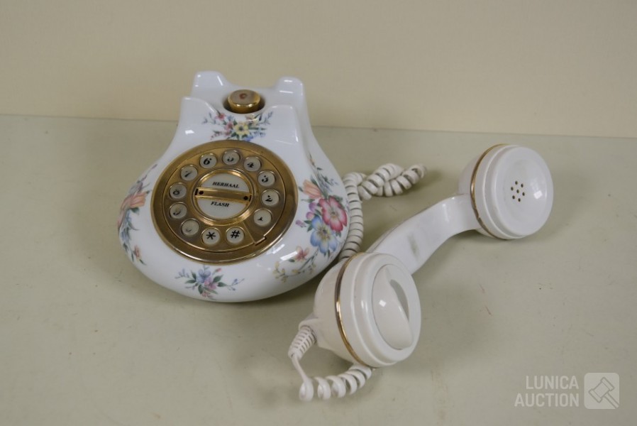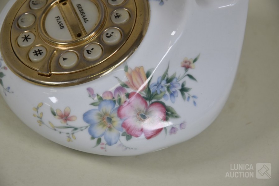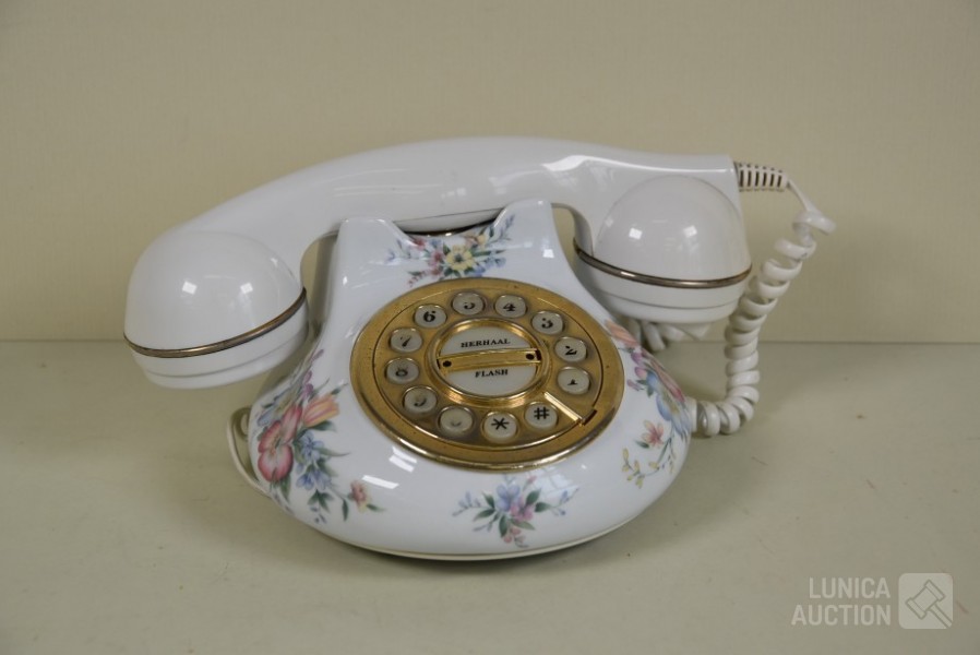 Porseleinen telefoon met kunststof hoorn. Afmeting 23x16 cm. Werking onbekend.