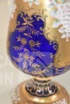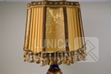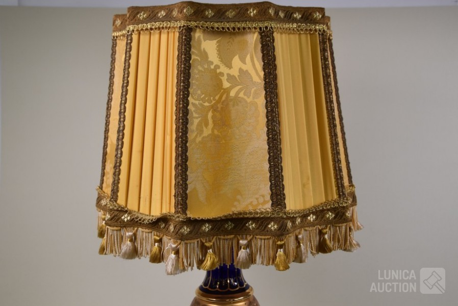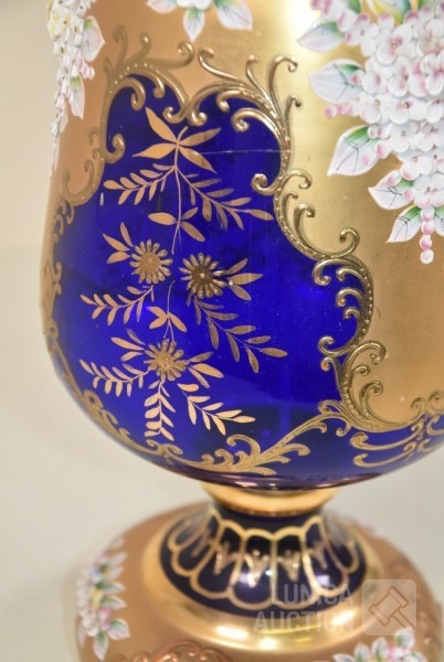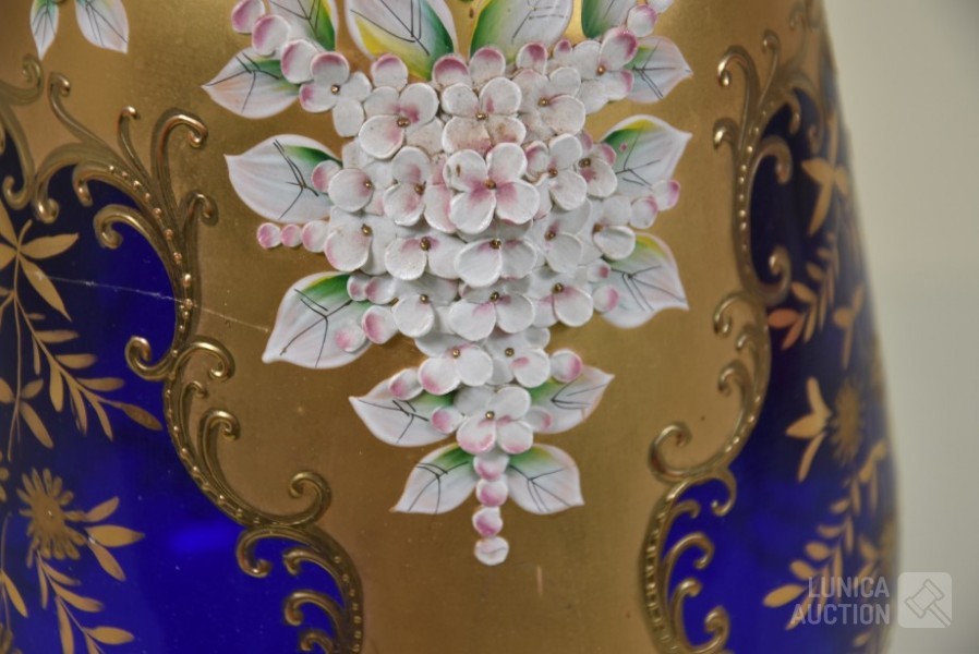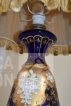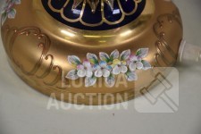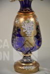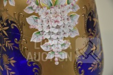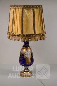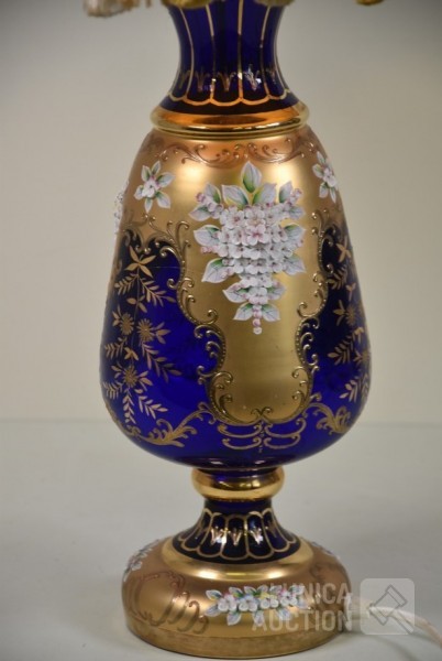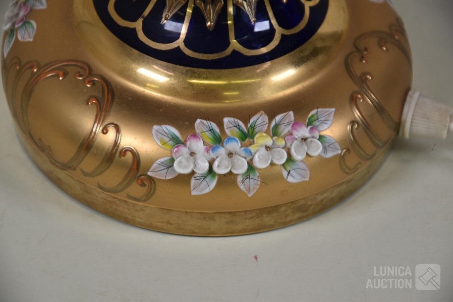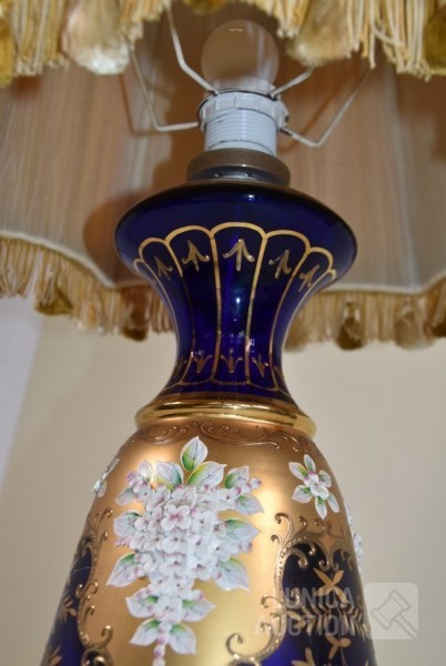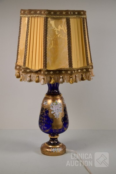 Boheems glas met "bladgoud" en kleine bloemen in emaille, in goede staat. Hoogte met lampenkap 70 cm! ,doorsnede lampenkap 35 cm