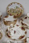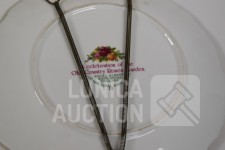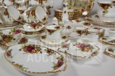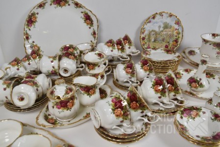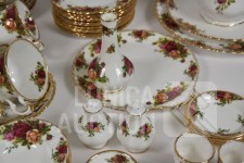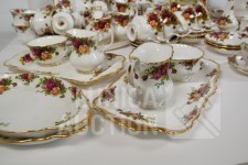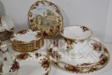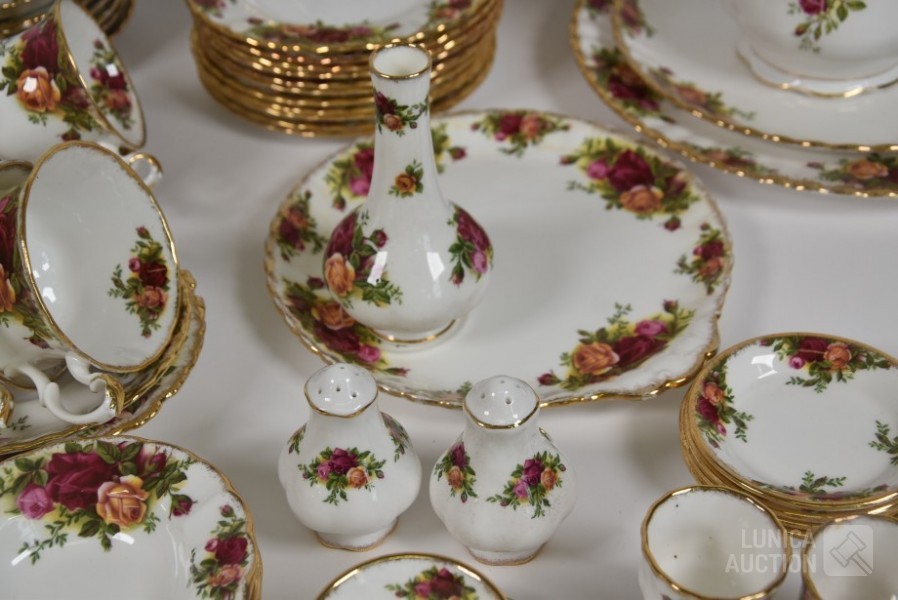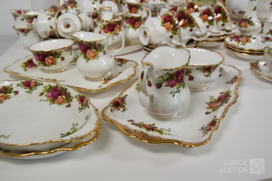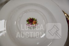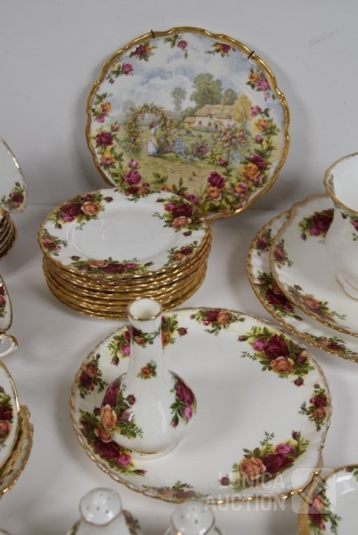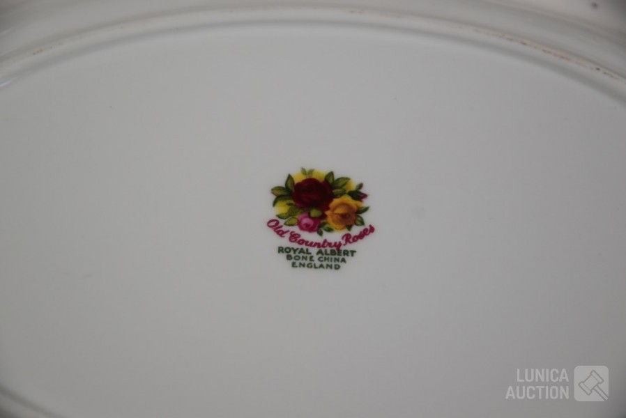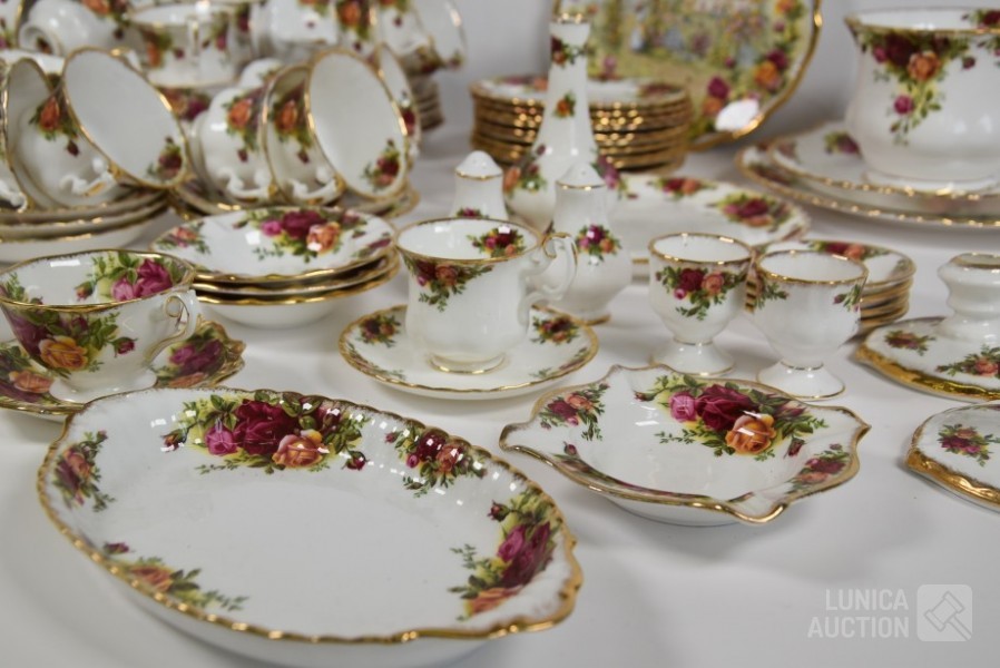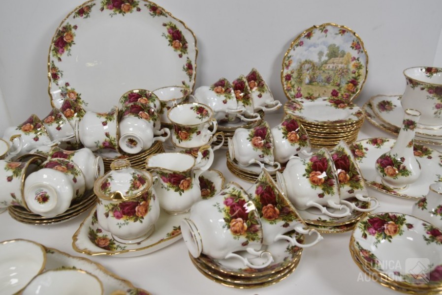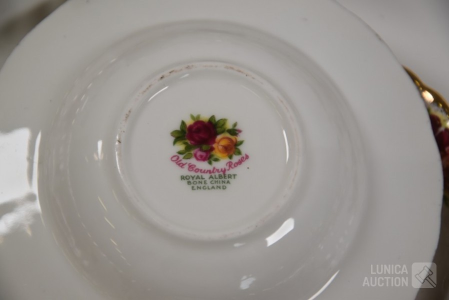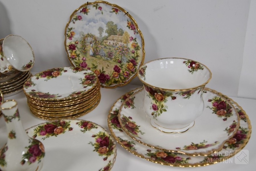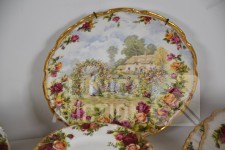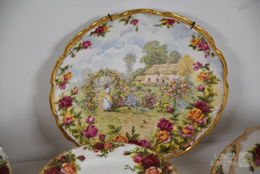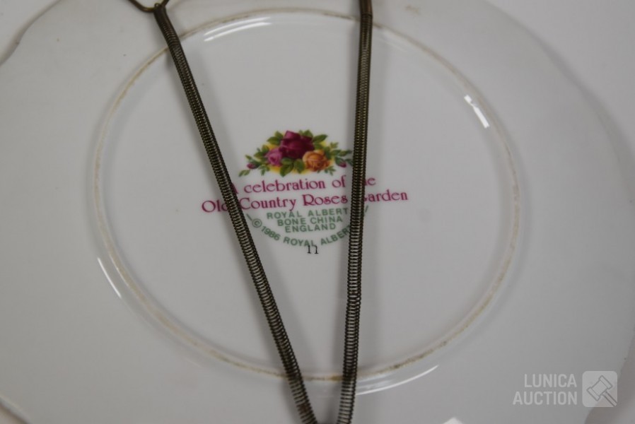o.a. kop en schtotels, roomstellen, gebaksborden, schalen, cakeschalen, vaas, bloempot, peper en zoutstel enz. Inclusief wandbord "a celebration of the old country Roses garden, 1986". Mooie verzameling.