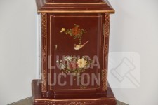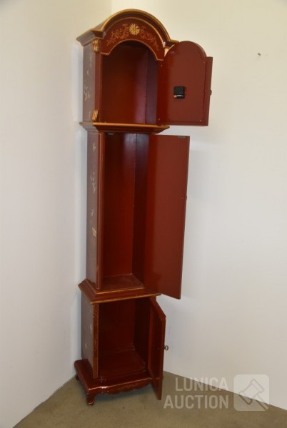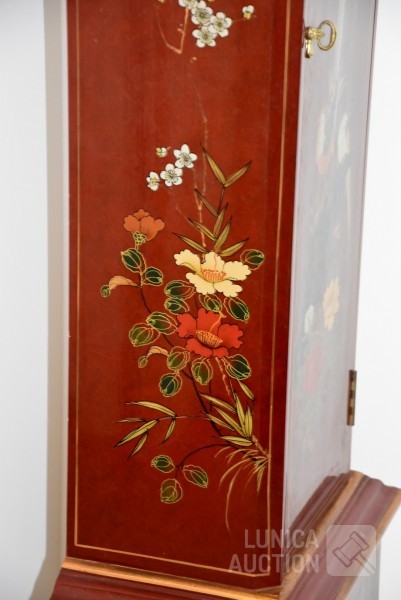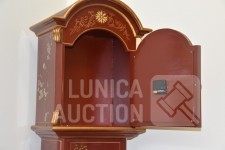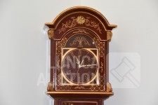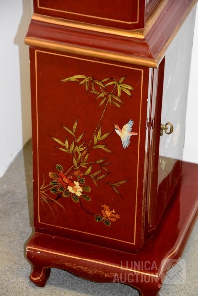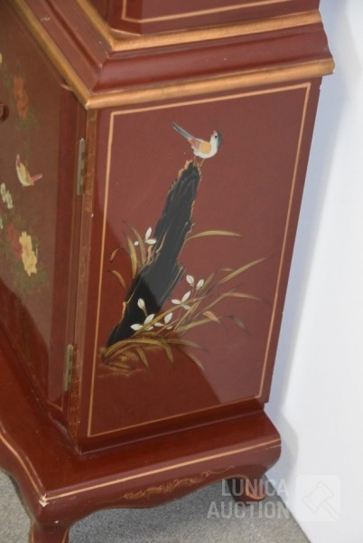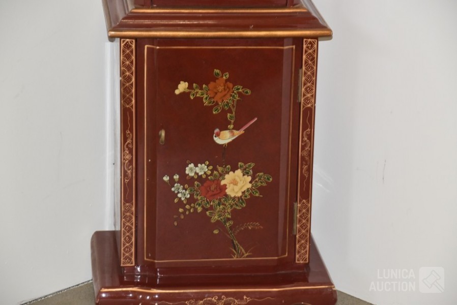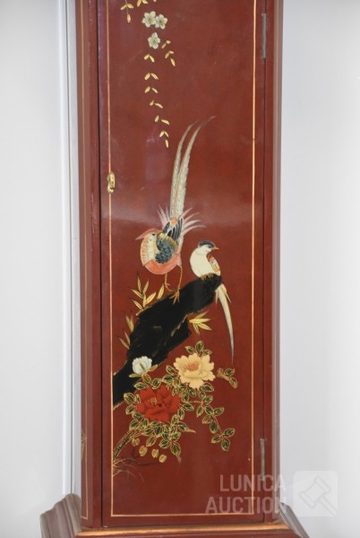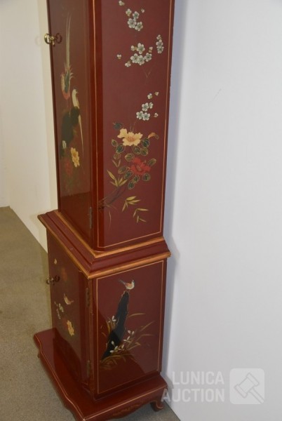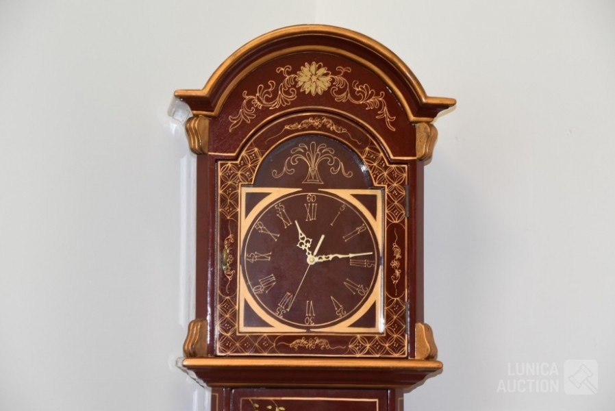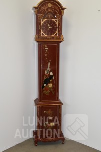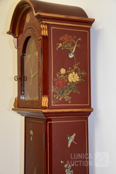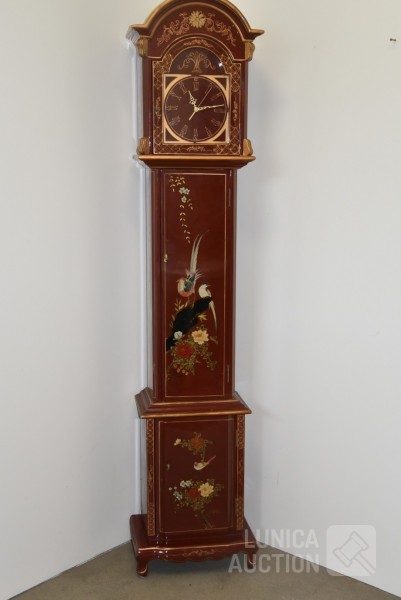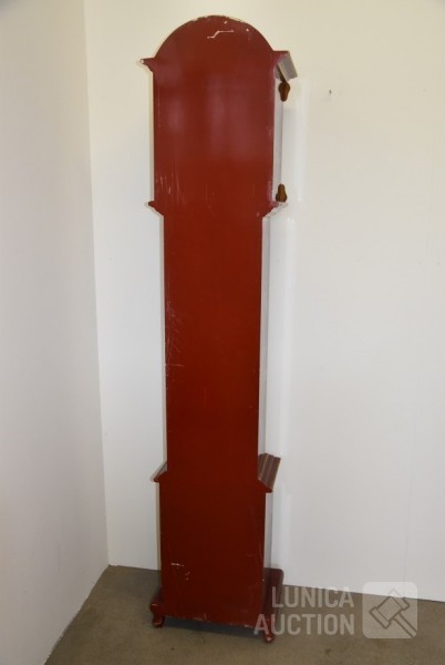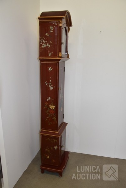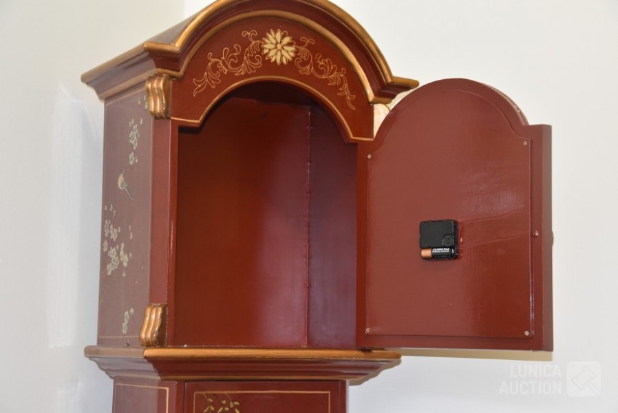 Uurwerk is werkend, op batterij!. Fraai gedecoreerd. Afmeting 40x30x204 cm! Kleur "ossenbloed rood".