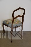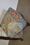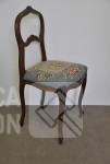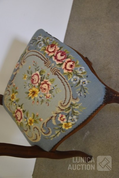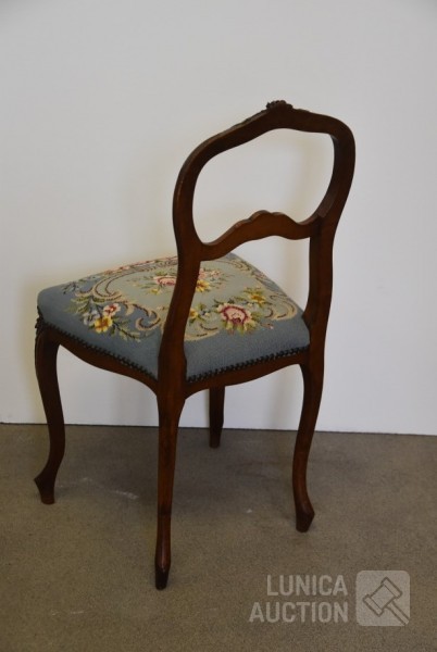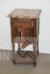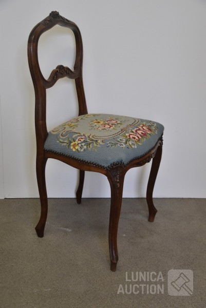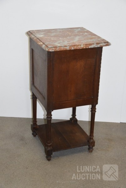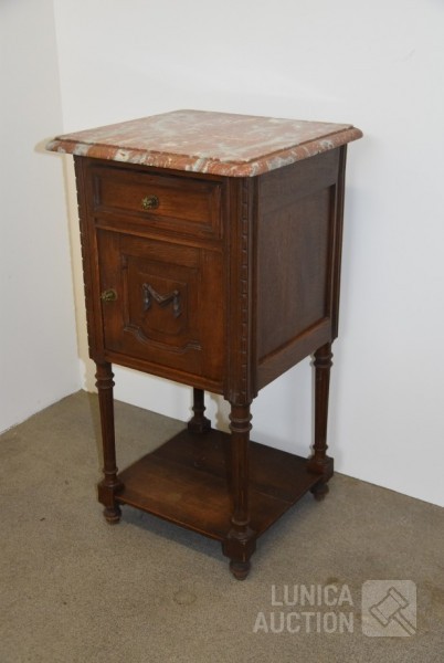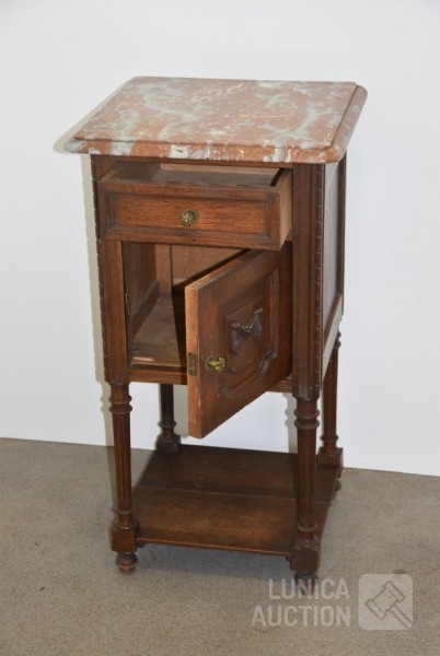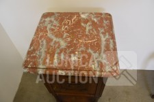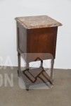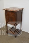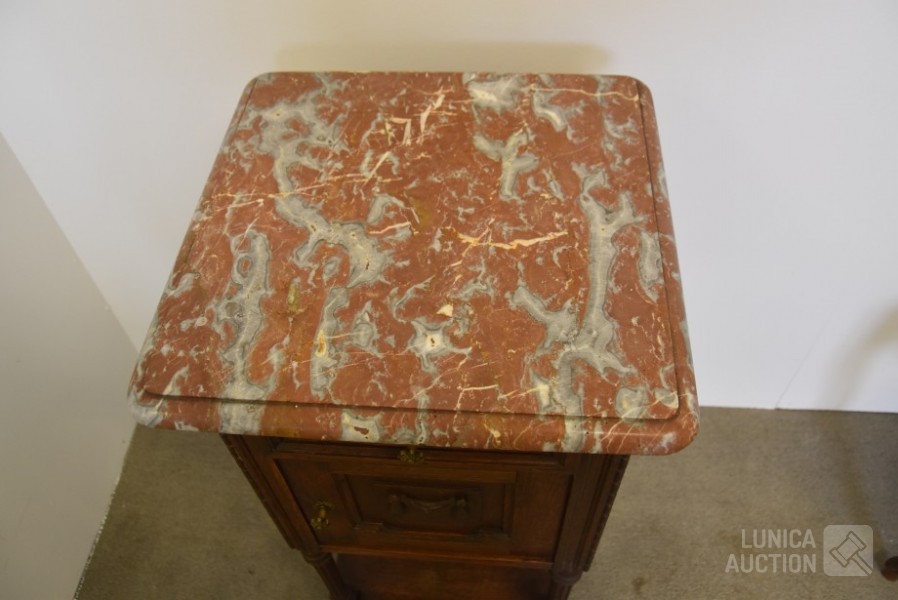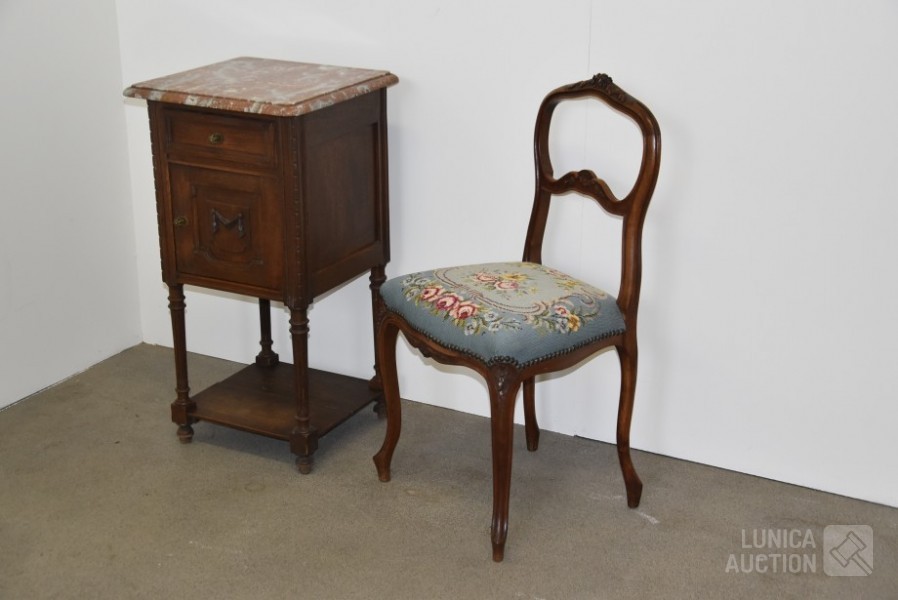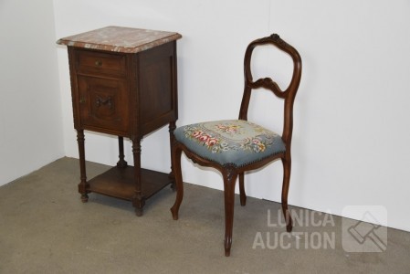 Nachtkastje met natuurstenen bovenblad, afmeting 41x41x80 cm.; Stoel, met geborduurde zitting, notenhout. Hoogte 85 cm. Beide in goede staat.