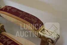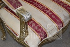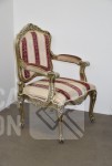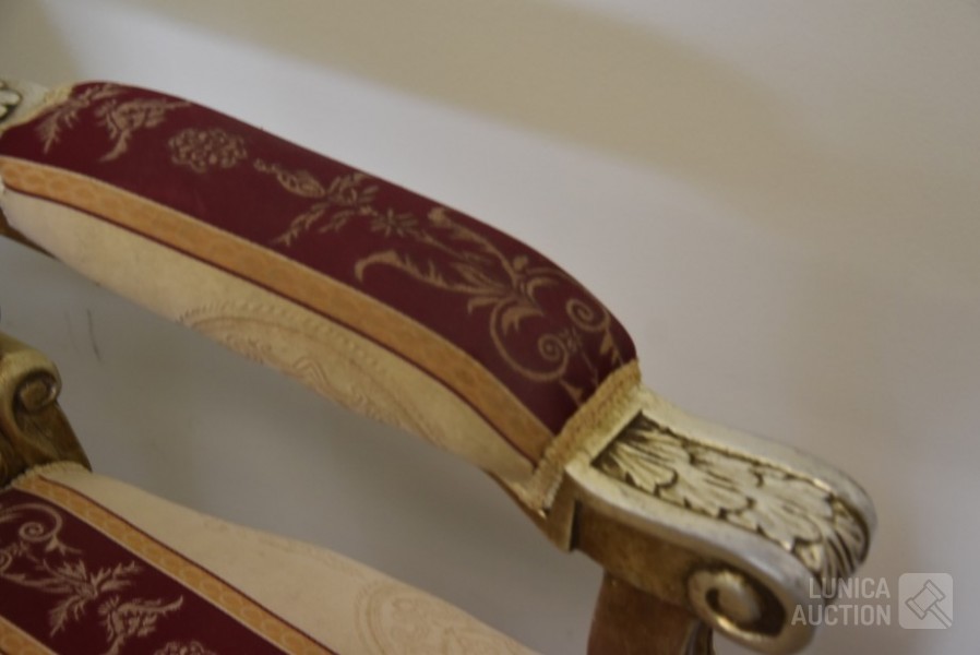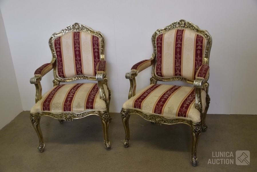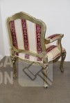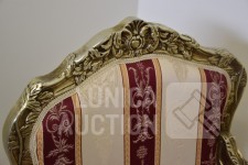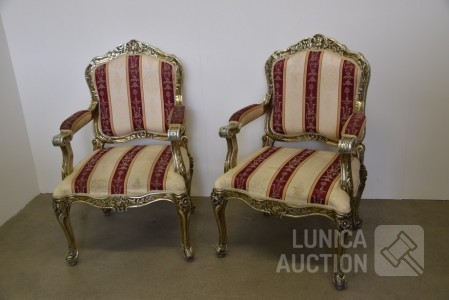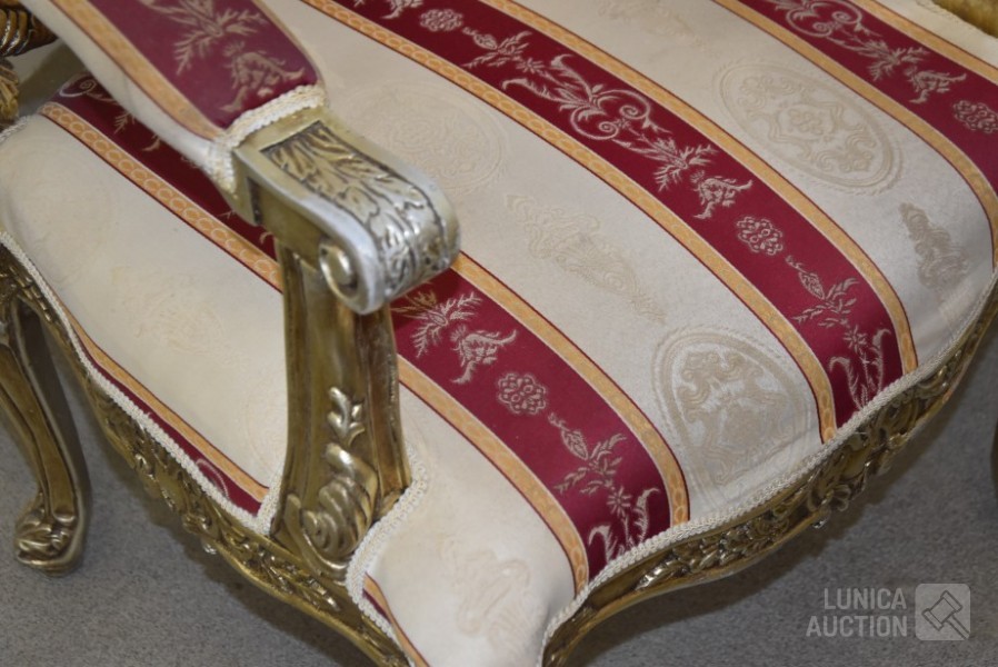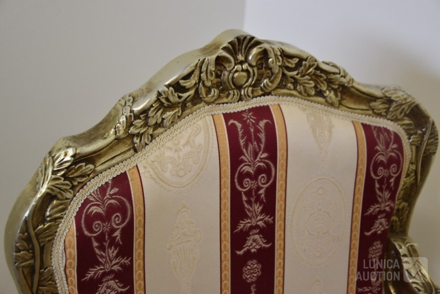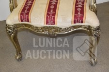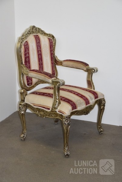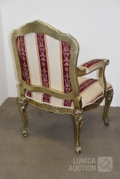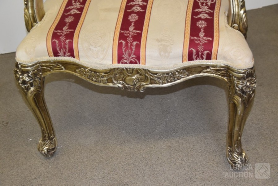 Houtsnijwerk in goudkleur, met gestreepte bekleding. Afmeting (bxdh) 66x73x106 cm. Lichte gebruikerssporen van armsteunen. Zeer decoratief.