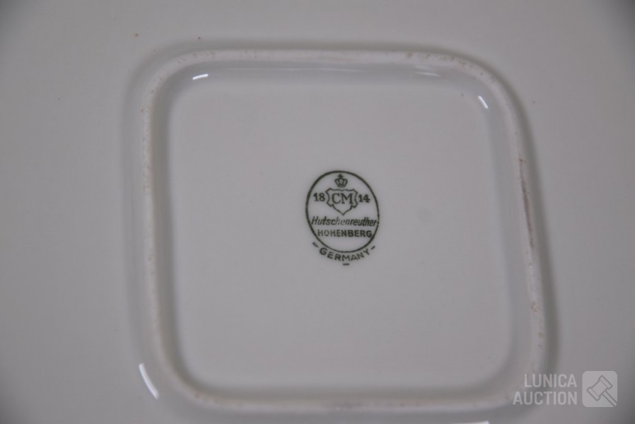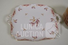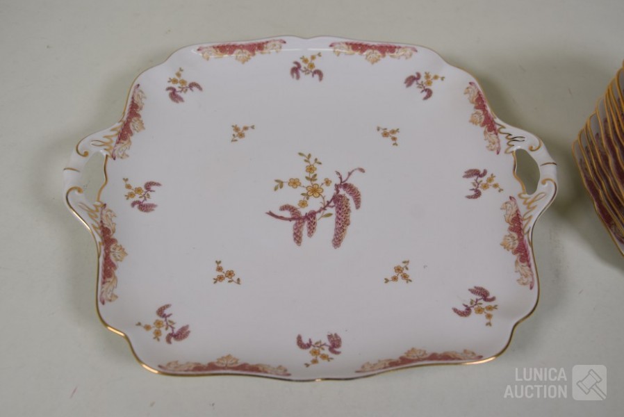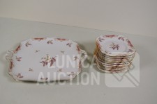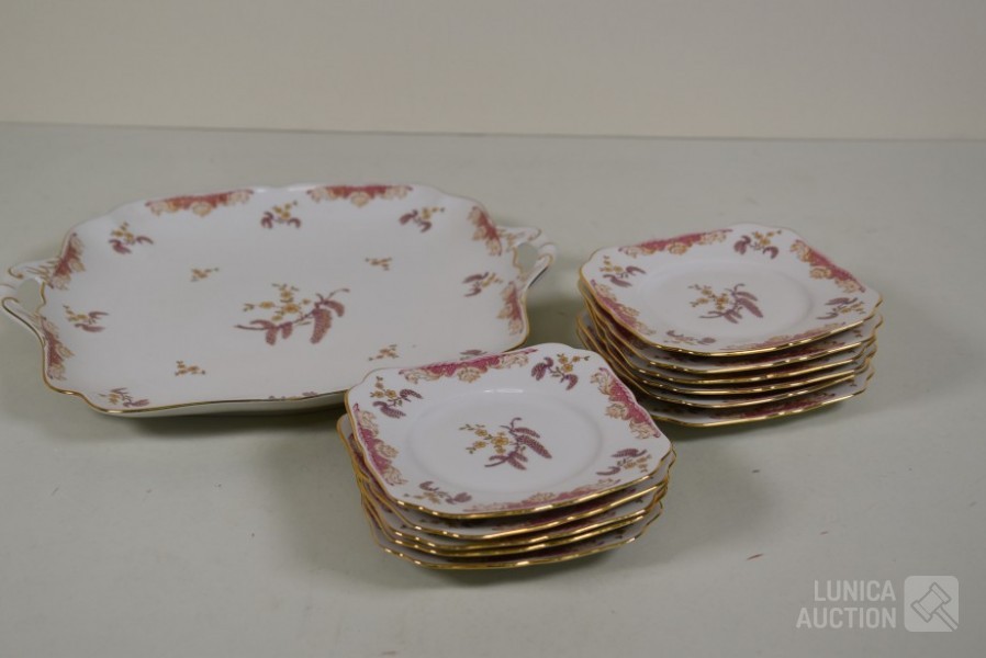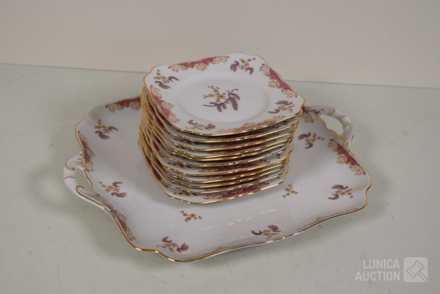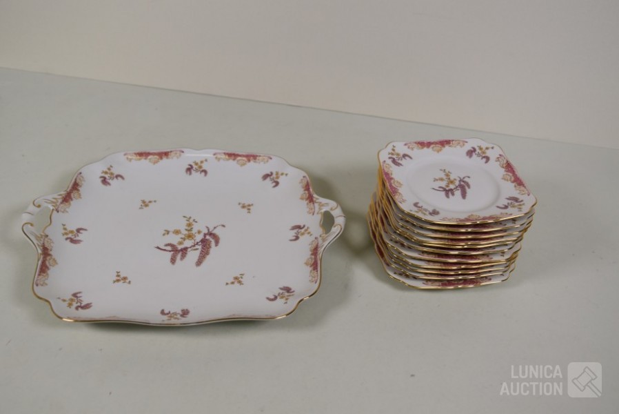 O.a. 11 gebaksborden; gebaksschotel, doorsnede 27 cm. Met goudrand.